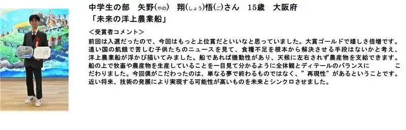 コメント:中1なのに、中学生部門で最優秀賞をもらえて、とても嬉しいです。食品ロスについて学んだ際に