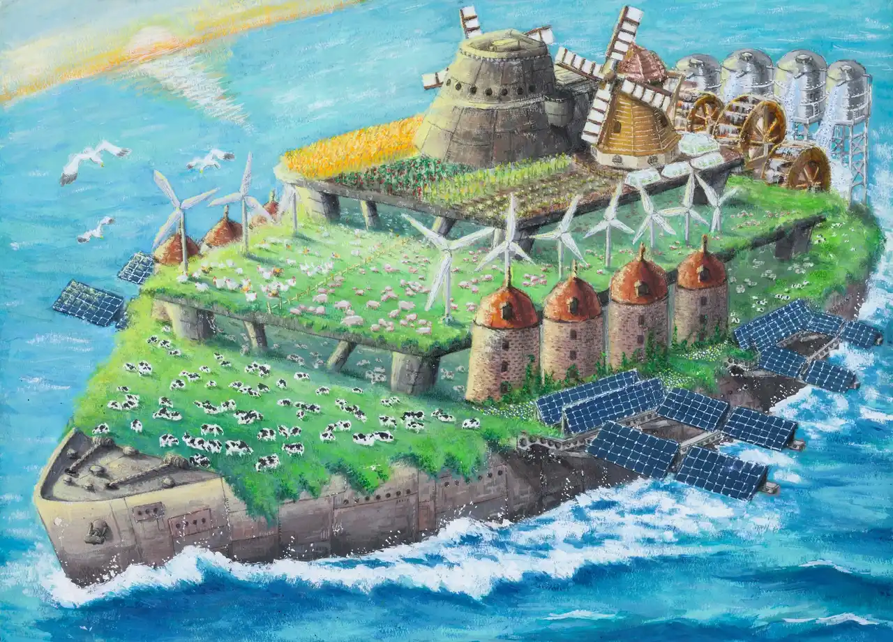 自然エネルギーを利用した「洋上農業船」です。食料不足で苦しむ国々まで移動が可能で、船で生産された食物を持続的に提供出来ます。また、天候の良い海に移動しての生産ができ、将来の食糧不足に活躍します。 |