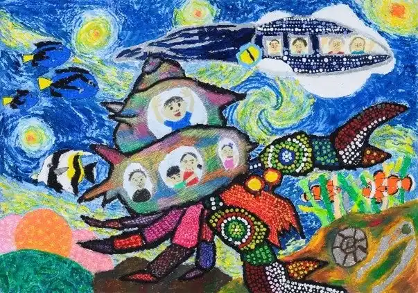 未来の旅行は海にも、僕の好きな絵の中にもどこにでも行けます。ヤドカリは安全に目的地まで運んでくれます。ワクワクする冒険旅行に家族みんなでいきたいです。 |