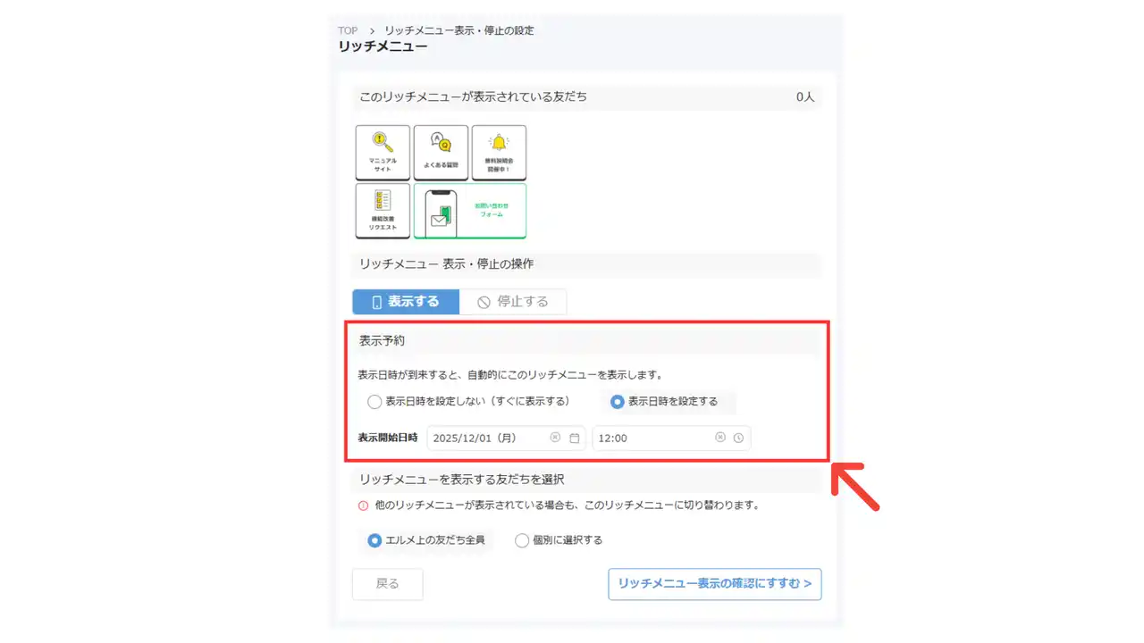 リッチメニューの管理画面から、表示開始日時を直接予約できるようになりました。