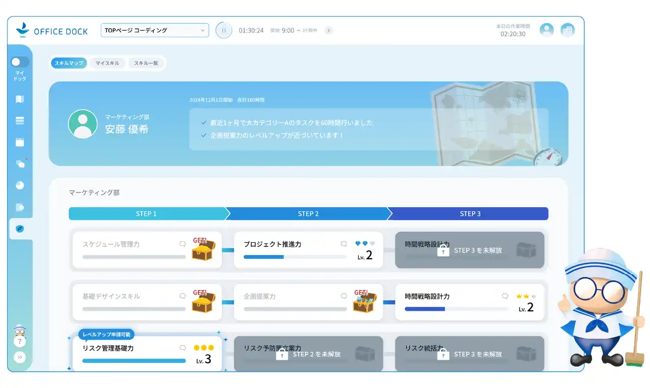 日々のタスク実行結果が、自動的に個人のスキルマップに反映されます。従業員はゲームのレベル上げのような感覚で、自身の現状と目標(次に習得すべきスキル)を直感的に把握可能。上司が細かく指示を出さなくとも、従業員が自ら考え行動する「自走型組織」の構築を促します。 |