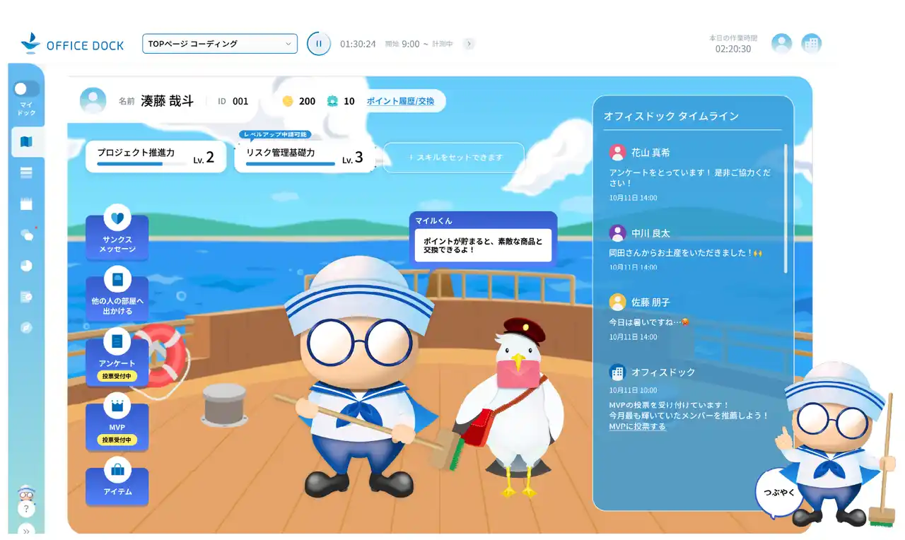本サービスの最大の特徴は、業務完了やスキルアップに応じて、ゲームのように「コイン」や「パール」が貯まる仕組みです。 |