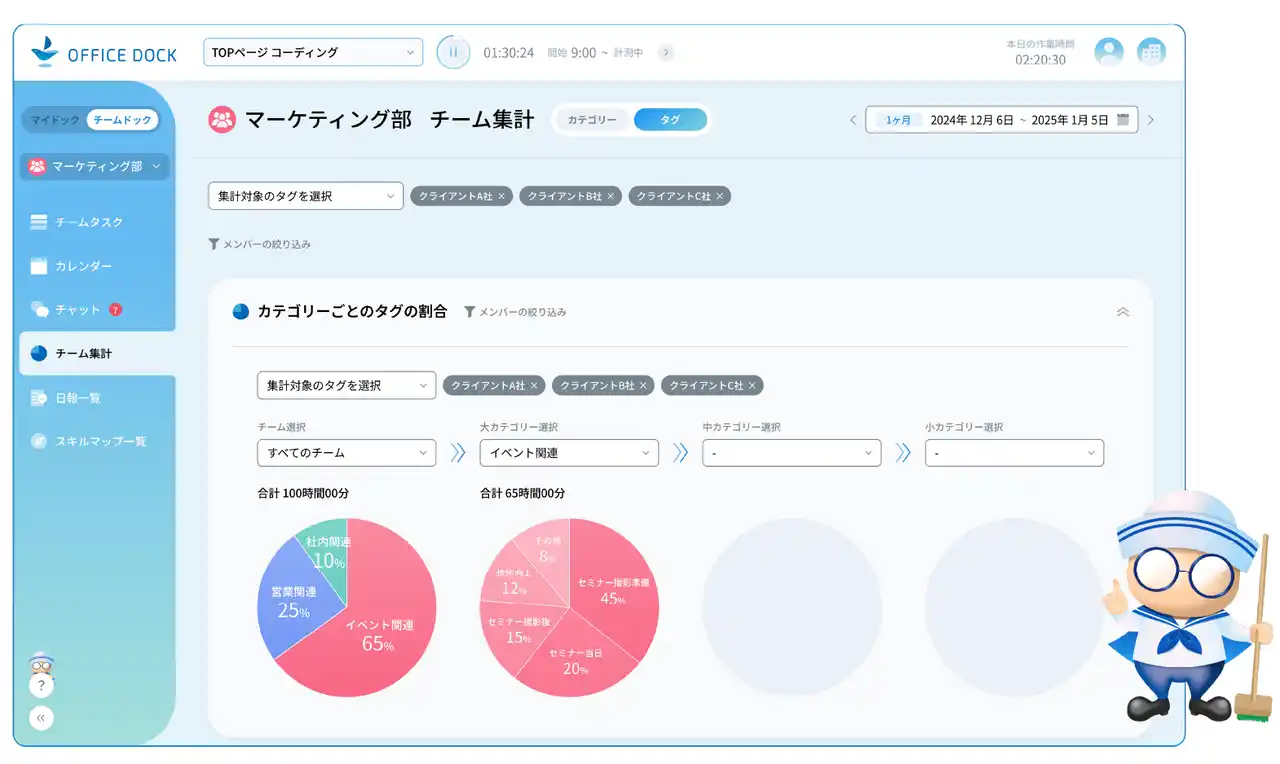 タスク管理機能と連動し、業務時間を自動集計します。どのプロジェクト、どの業務カテゴリーにどれだけの時間が投下されたかを構造的に把握。「売上-原価(人件費含む)=粗利」の予実管理がリアルタイムで可能となり、勘や経験に頼らないデータドリブンな経営判断を実現します。 |