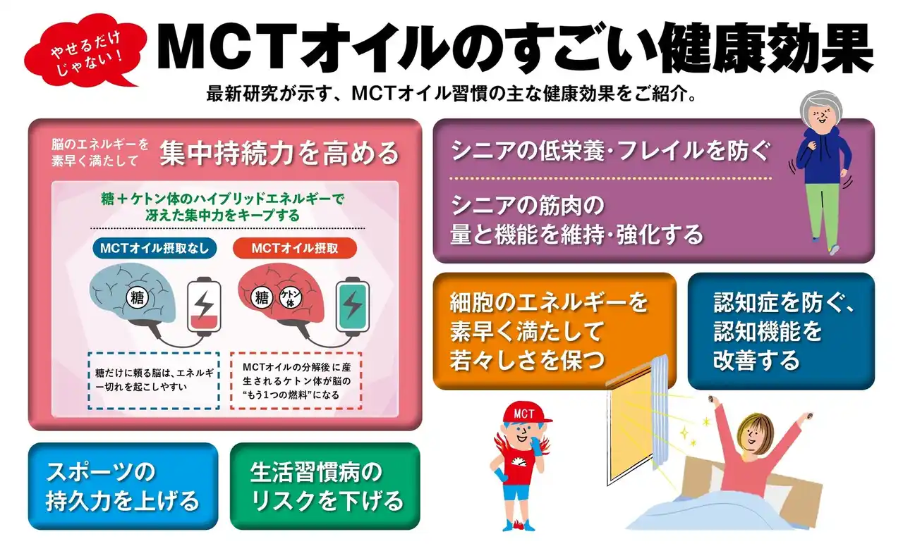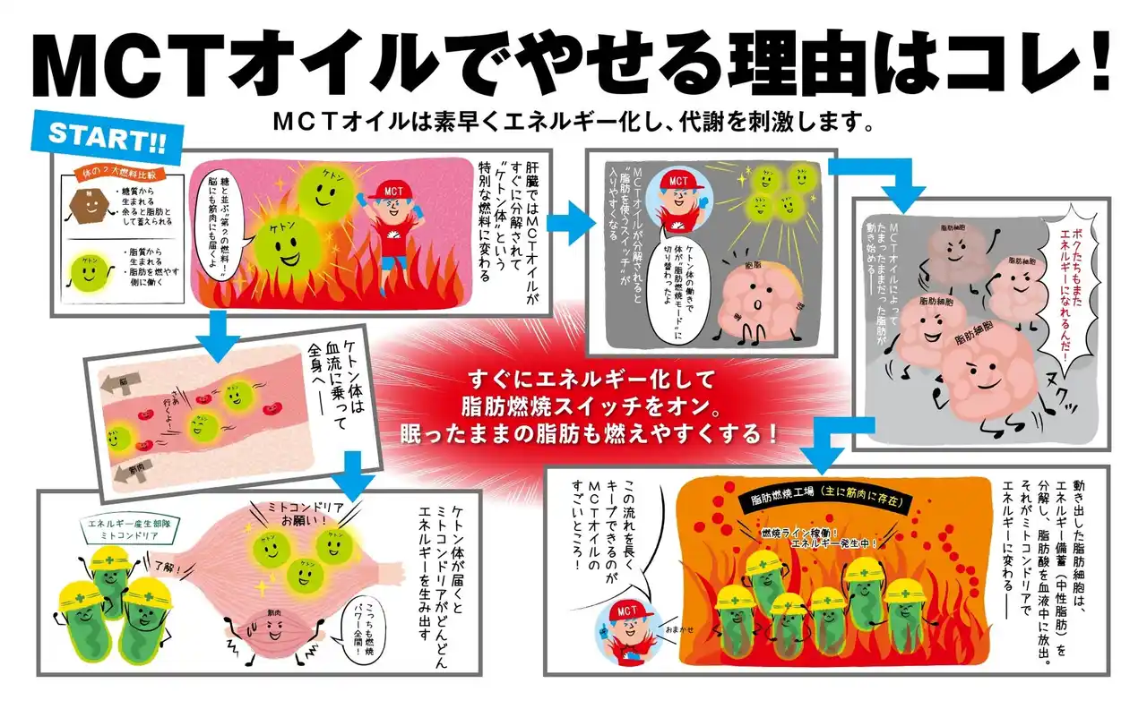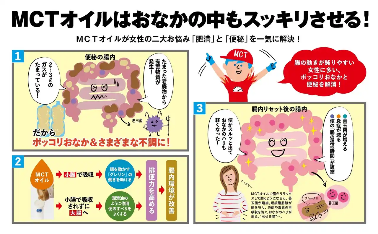 そして、すでについている体脂肪にも作用し、エネルギー化しやすくする働きももっています。さらに、吸収されたMCTオイルの一部は、腸を動かすホルモン「グレリン」の働きを助け、排便を促し、吸収されなかった一部のMCTオイルは、大腸で潤滑油として作用。便のすべりをよくすることも明らかになっています。 |