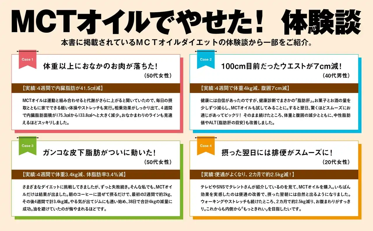「4週間で体重が4kg減!腹囲が7cm減!」など、MCTオイルの摂取を実践して、うれしいダイエット効果、便秘改善効果を得た体験談が本誌に続々と集まりました。 |