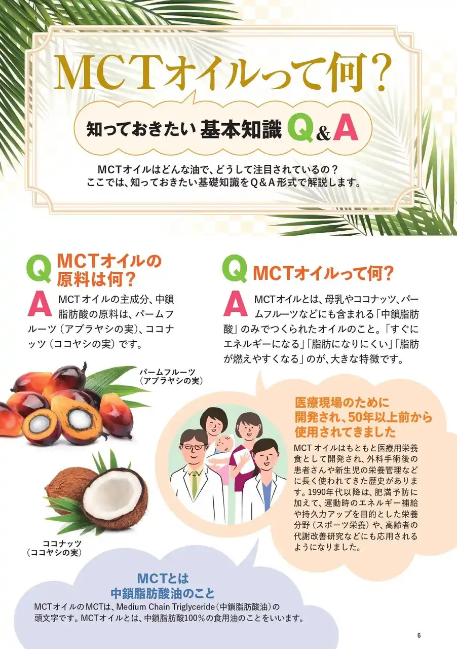 それが、「MCTオイル(中鎖脂肪酸100%の食用オイル)」です。中鎖脂肪酸は、ココナッツやパームフルーツ、母乳などにも含まれる天然成分。一般的な油の成分(長鎖脂肪酸)と比べて、吸収・代謝が約4倍速く、摂取後すぐにエネルギーに変換されます。そのため体脂肪になりにくいのが特徴です。 |