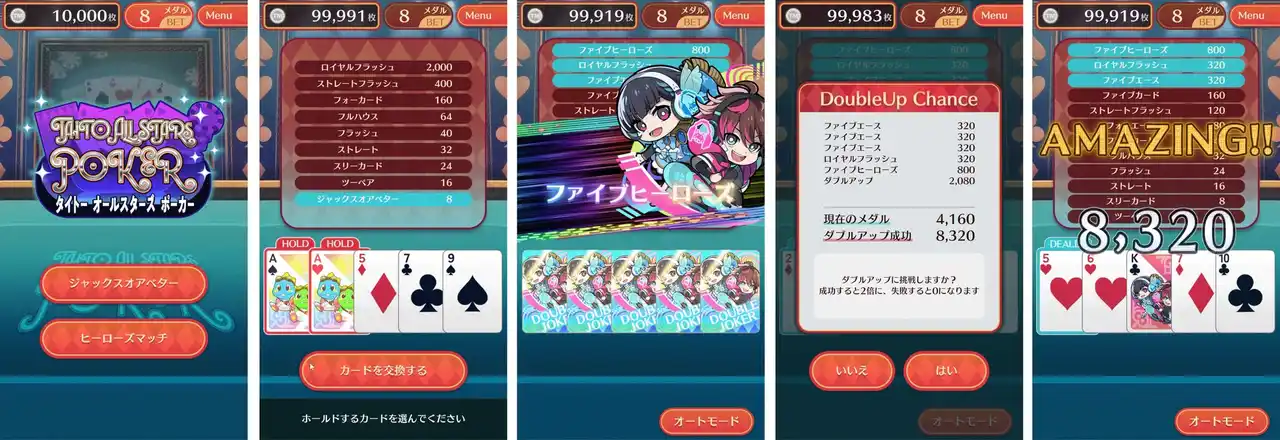 ジャック以上の1ペアから役が成立するスタンダードなポーカー「ジャックスオアベター」と、ジョーカーを集めて高配当を目指す特別ルール「ヒーローズマッチ」の2つの遊び方から選べます。 |