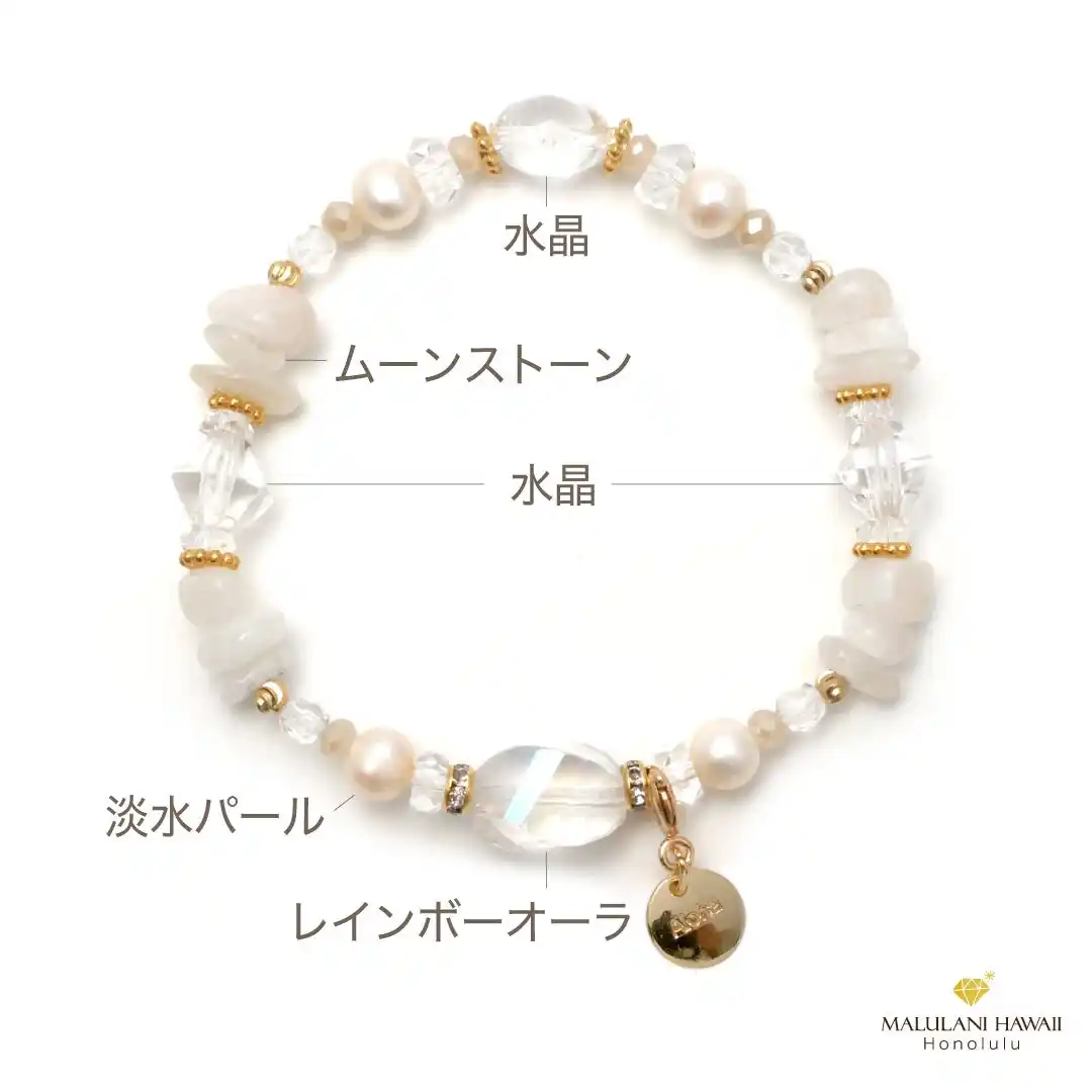 レインボーオーラ:浄化・潜在能力を引き出す ムーンストーン:癒し・幸福・恋愛と結婚のお守り・潜在能力の開花 淡水パール:魅力を引き出す・品格を高める・幸運を呼ぶ 水晶:総合運上昇・他の石の力を高める・浄化 |