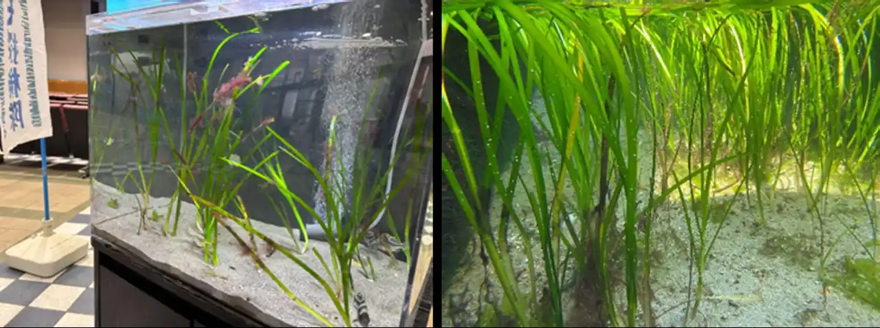 「アマモ」とは、日本各地、浜名湖の海中に生えている海草で、タネで株を増やす増え方が陸上のイネと似ています。根をかじると甘い味がするので「アマい+藻」=アマモの名前がつきました。魚や貝、エビやカニなどの生き物が卵を産み、子どもを育てるのにちょうど良い場所になるため「海のゆりかご」と呼ばれます。約11年ほど前から浜名湖のアマモが減り続け、豊かな浜名湖の生態系に影響を与えています。 |