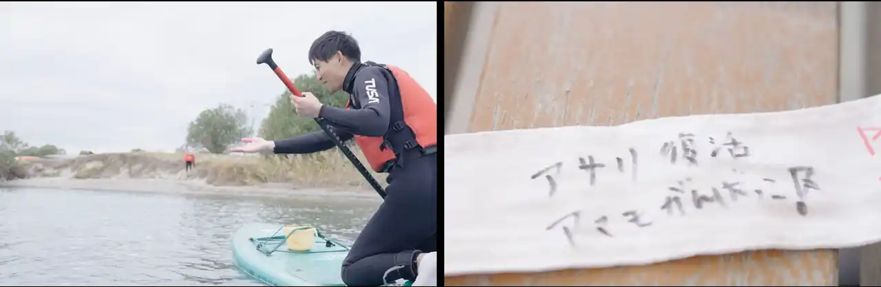浜名湖は湖西市と浜松市という2つの市で囲まれています。両市の海域でアマモが繁茂することを願い、リレー形式でたすきに思いを書き入れて、アマモ再生への思いをつなぎました。また、浜名湖周辺でも放置竹林の拡大が問題となっていて、その竹の活用方法として「竹SUP」を地元団体が発明しました。今回の種まき活動にも活用しました。2市でたすきをつなぎ、2市の市民が一緒に活動に参加することでワンチームでアマモ再生に取り組んで行く決意をあらたにしました。 |
