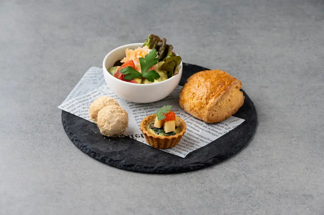 | 中段:海老とアボカドのサラダ、スコーン、アワビのキッシュ、きなこのブールドネージュ | |||||||||||||||||||