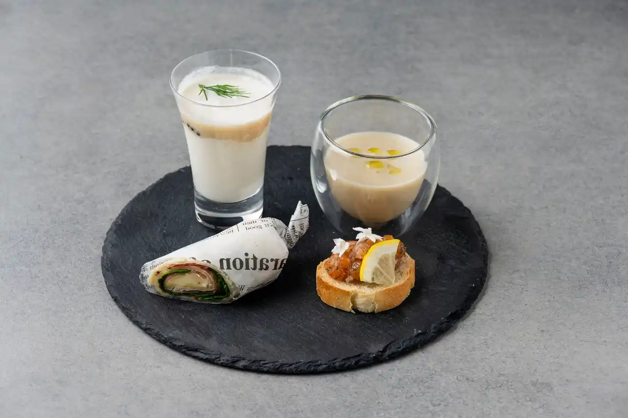 | 上段:カリフラワーのムース コンソメジュレ、本日のスープ、ノルウェーサーモンのタルタル、鴨生ハムとルッコラのトルティーヤ | |||||||||||||||||||