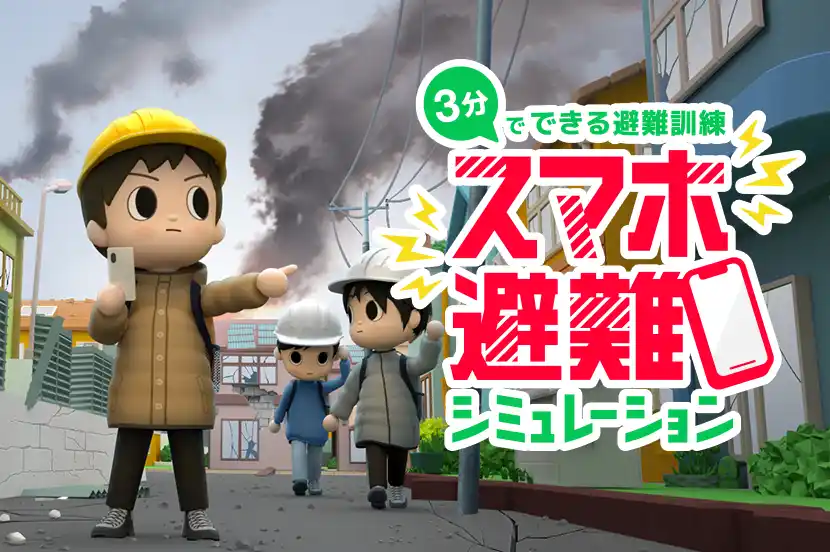 「スマホ避難シミュレーション」で防災行動力を高めよう。あなたは正しい行動を選択できますか? 「スマホ避難シミュレーション」で防災行動力を高めよう。 |