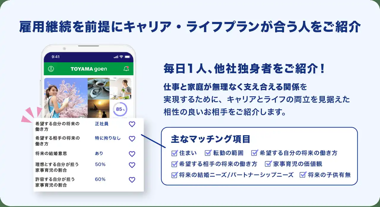 「出会いは、キャリアとライフの両立に大きく影響します。当社は、富山県内の “働き続けられる環境”と“家族を築ける環境”の両立を支援し、共働き・共育てを支え合う未来の実現に貢献したいと考えています。」 |