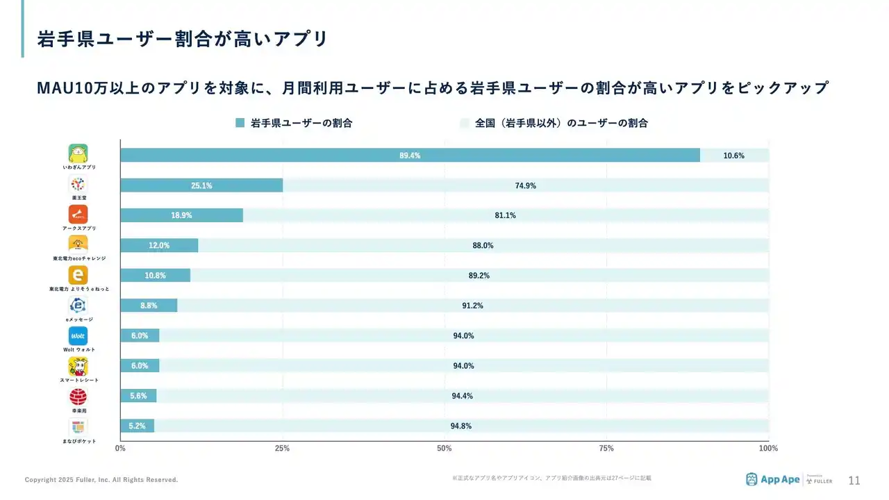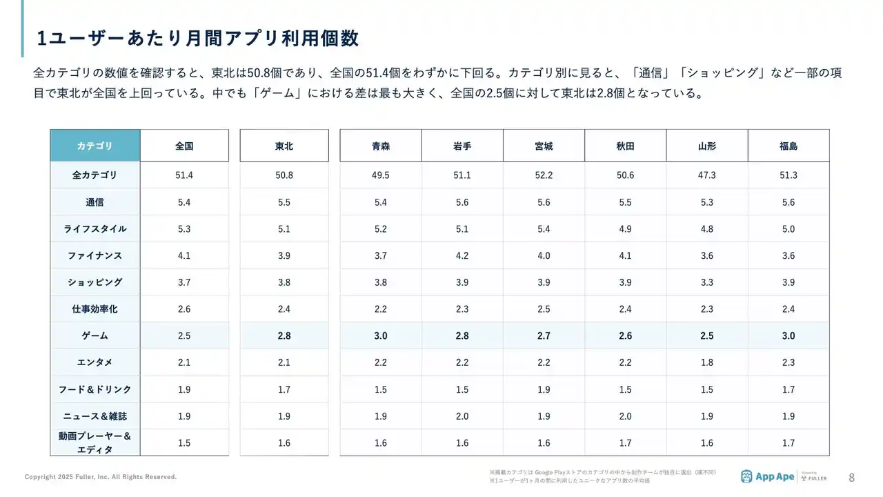 | フラー株式会社(本社:新潟県新潟市、代表取締役社長:山崎将司、以下「フラー」)は、アプリ市場分析サービス「App Ape(アップ・エイプ)」に蓄積するデータをもとに、東北6県(青森・岩手・宮城・秋田・山形・福島)におけるスマートフォンおよびアプリ利用の実態をまとめた「都道府県別アプリ利用動向レポート2025 東北編」を公開しました。 | |||