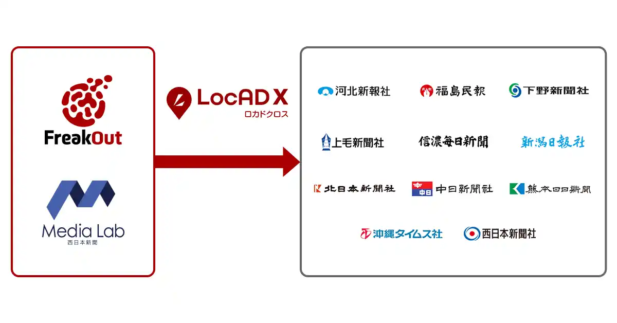 | 具体的には、フリークアウトが持つ位置情報データ・広告配信の技術を、西日本新聞メディアラボが提供する位置情報広告サービス「LocAD X」(ロカドクロス)に実装し、精緻な地点ターゲティングやGPSを活用した来店計測など大幅な機能アップデートを実施します。西日本新聞メディアラボが持つ総合的な広告提案力と、全国地方新聞社ネットワークを活用し、地域経済の活性化と、小売・有店舗事業者・行政機関のデジタルトランスフォーメーション(DX)を強力に推進します。 | ||||||
