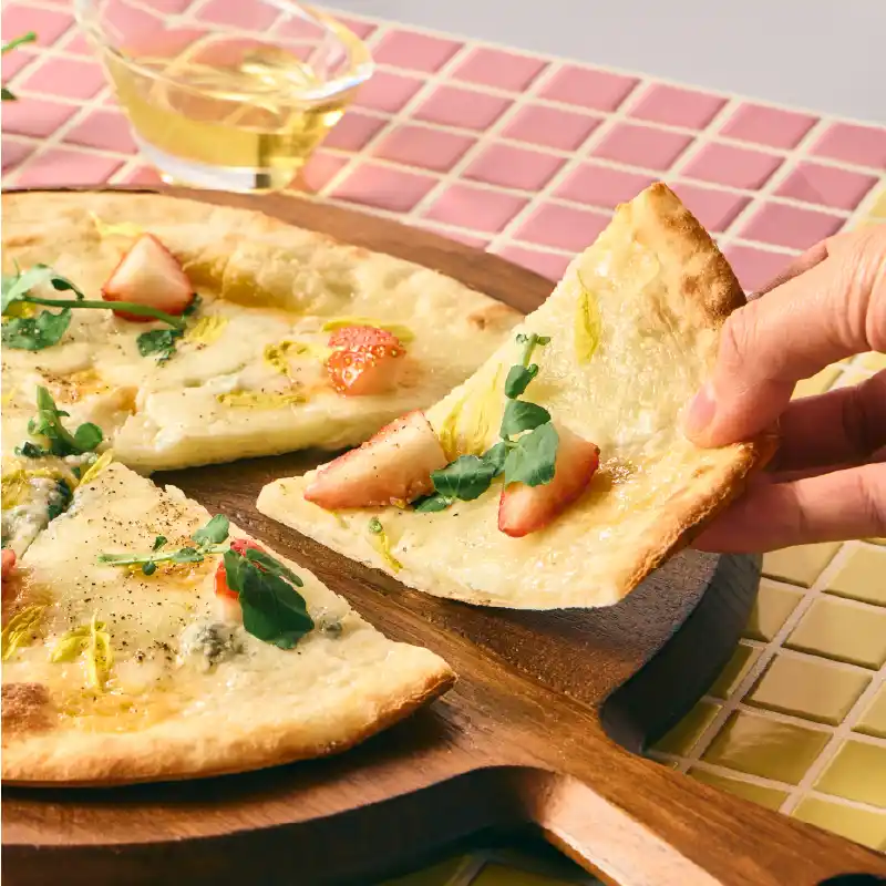 ゴルゴンゾーラ、モッツァレラを含む4種のチーズといちごを贅沢に使用し、香ばしく焼き上げたピザです。チーズの豊かな塩気と、熱が加わり甘みが凝縮された温かい苺の甘みが絶妙に溶け合う、甘じょっぱい新感覚の一品。お好みで蜂蜜をかけて、さらに奥深いハーモニーをご堪能いただけます。 |