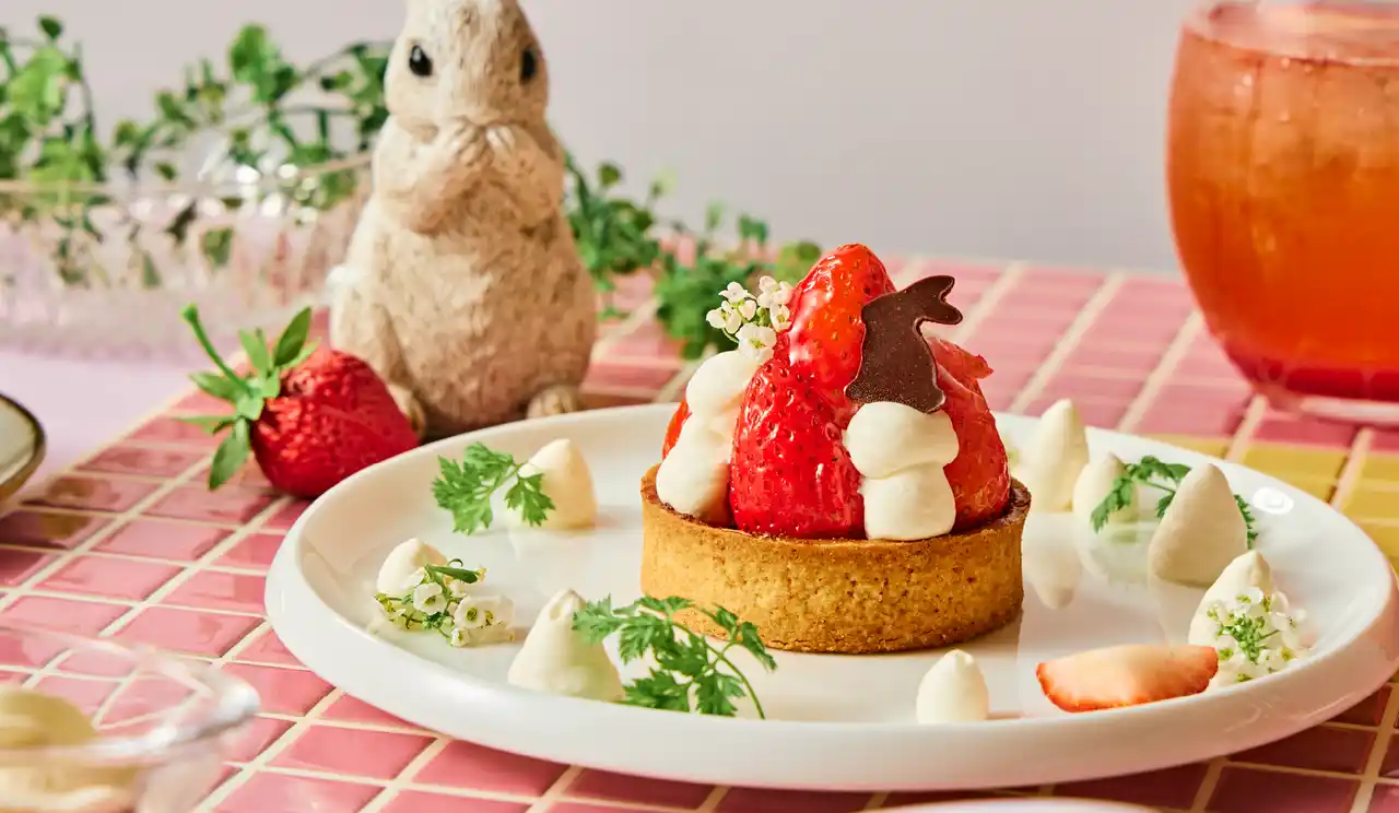 ・イースターガーデンストロベリータルト:王道のストロベリータルトに、愛らしいイースターバニーをデコレーションした繊細でクラシカルなスイーツ。さくさくの生地にアーモンドクリームを流し込み、滑らかなカスタードクリームとたっぷりのいちごを載せました。お皿に飾っているエディブルフラワーと生クリームはガーデンを彷彿とさせ、庭でエッグハントをしている子うさぎを再現した、イースターならではの一皿です。 |