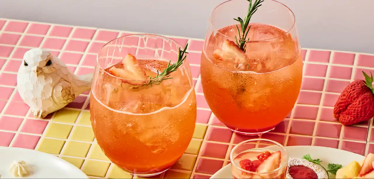 ・ストロベリーモクテル:フレッシュないちごシロップをスパークリングウォーターで割り、淡い色合いに仕上げました。スカッシュのような爽快感がありながら、グラスの縁にローズマリーを添えることで、モダンで優雅なティータイムに花を添えます。 |