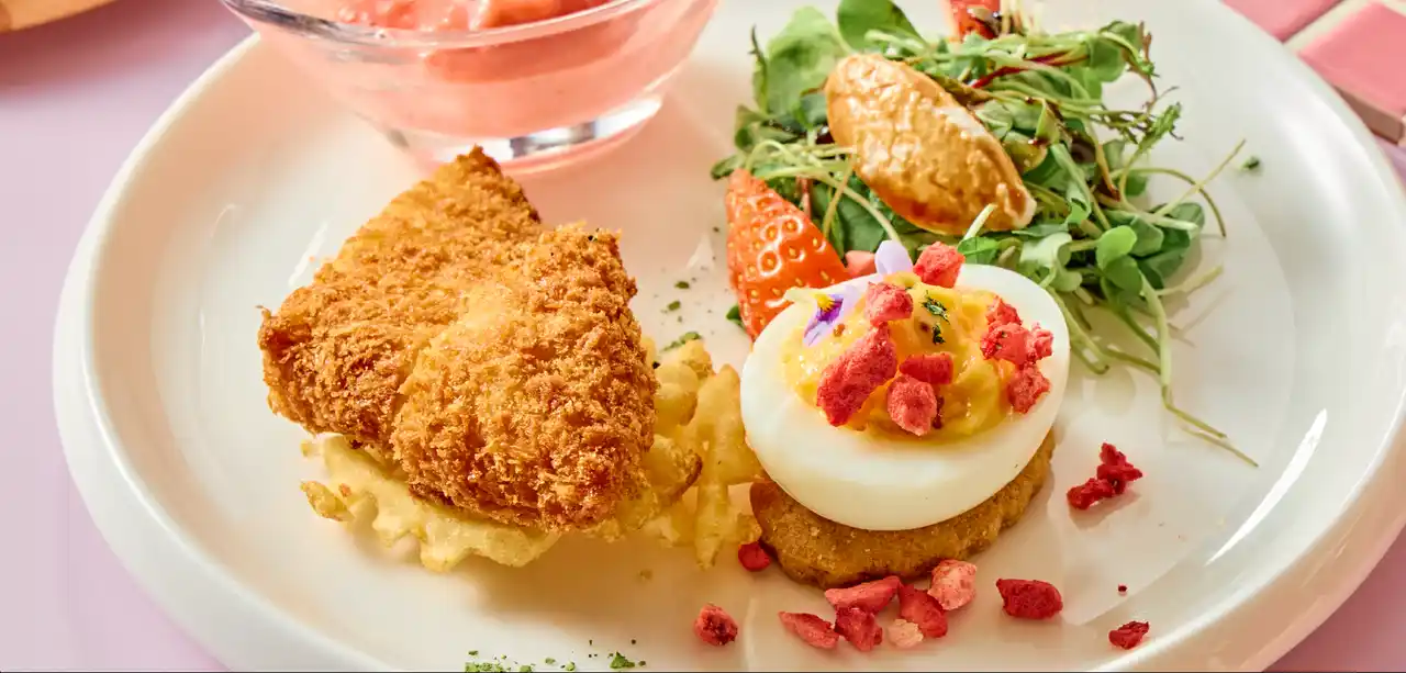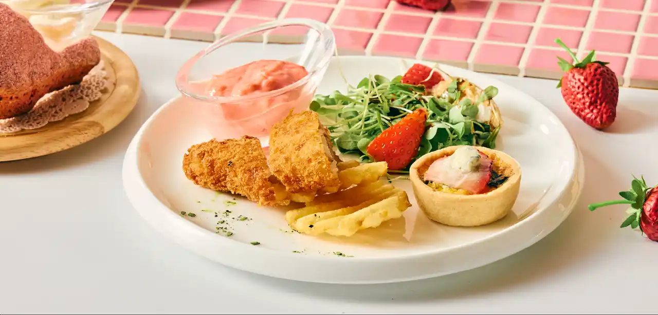 ・フィッシュアンドチップス 苺タルタルソース添え:イギリスのソウルフードであるフィッシュアンドチップスに、いちごを加えた美しいピンク色のタルタルソースを添えました。クラシックなメニューにモダンな遊び心を加えた一品です。 |