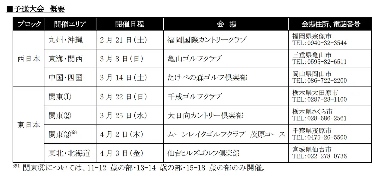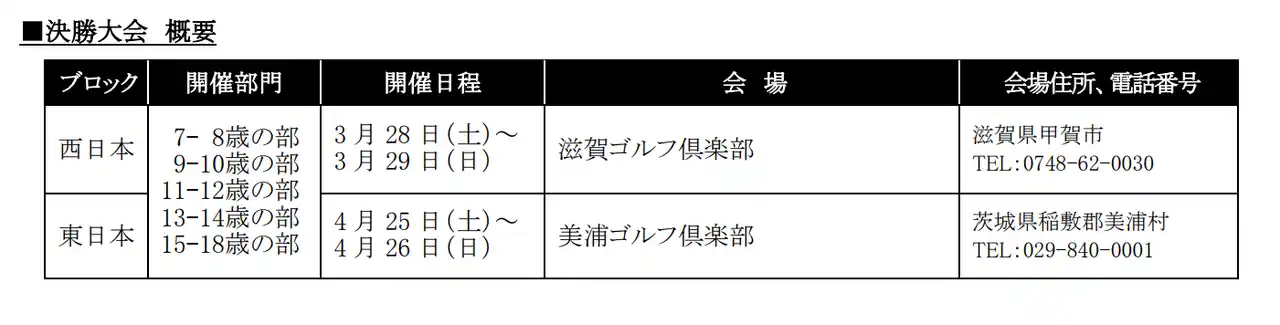 リトルジュニアゴルフ大会」1会場)の会場として提供します。 本大会では、各予選大会を勝ち抜き、決勝大会に参加した各カテゴリ男女の上位1名~2名に、2026年7月にアメリカ・カリフォルニア州サンディエゴで開催される『世界ジュニアゴルフ選手権』の出場権が付与されます。出場選手は「PGM日本代表選手団」としてアメリカへ派遣され、PGMはIJGAを通じて「PGM日本代表選手団」のサポートを行います。 なお、現状の『世界ジュニアゴルフ選手権』において、「U-6」の部のカテゴリがなくなったことに伴い、「U-6」の部に関しては「PGM U-6 リトルジュニアゴルフ大会」と名称を変えて、別大会として開催します。 PGMは、ジュニアゴルファーに向けた様々な取り組みを行うなかで、ジュニアゴルファーに活躍する機会を提供するなど、今後も積極的に支援を行ってまいります。 ■大会概要 ・大 会 名 称 :PGM世界ジュニアゴルフ選手権 日本代表選抜大会 ・主 催 :一般社団法人 国際ジュニアゴルフ育成協会(IJGA)、株式会社ビーエスフジ ・特 別 協 賛 :パシフィックゴルフマネージメント株式会社 ・協 賛 :住友ゴム工業株式会社、株式会社日能研関東、キャロウェイゴルフ株式会社 ・後 援 :日本ゴルフ協会(決勝大会のみ)、日本プロゴルフ協会、日刊スポーツ新聞社、株式会社ALBA ・日程 / 会場 :2026年2月~4月に7会場で予選大会、2026年3月~4月に2会場で決勝大会を全てPGM運営ゴルフ場にて開催 ・出 場 資 格 :7~18歳までのジュニアゴルファー ・参 加 方 法 :IJGAホームページよりエントリー https://www.ijga.or.jp/ ・募 集 人 数 :1,000名 ・代表選手選抜人数 : 7-8歳、9-10歳、11-12歳の部/男女各2名13-14歳、15-18歳の部/男女各4名 ・派 遣 先 :世界ジュニアゴルフ選手権 ・開 催 日 程 :2026年7月7日(火)~7月9日(木) ・開 催 場 所 :アメリカ・カリフォルニア州サンディエゴ Torrey Pines(トーリーパインズ)他 |