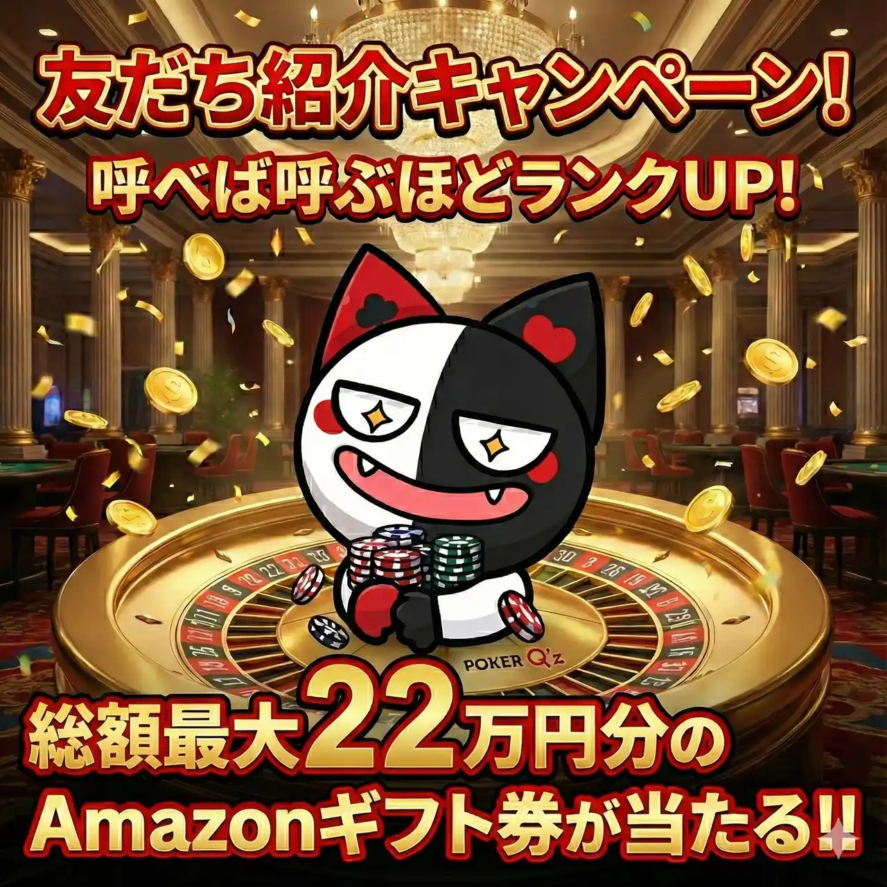 | 50,000ダウンロードを記念して、期間内にPOKER Q’z を友だちに紹介すると、景品がどんどん豪華になるキャンペーンを実施します。 | |||