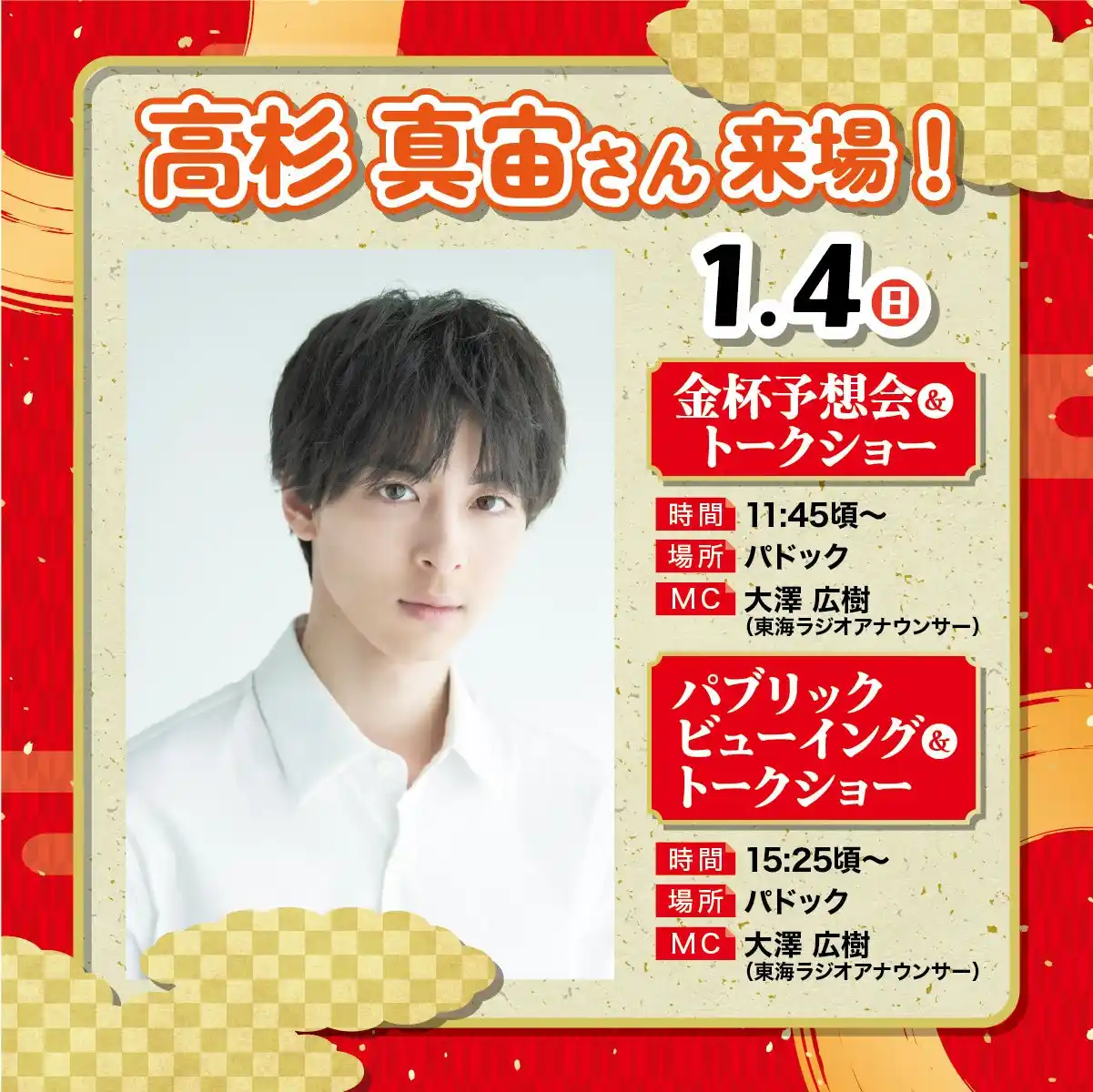 人気俳優の高杉真宙さんが来場し、当日の中山金杯、京都金杯の予想会やパブリックビューイングなどのトークショーを開催します! |