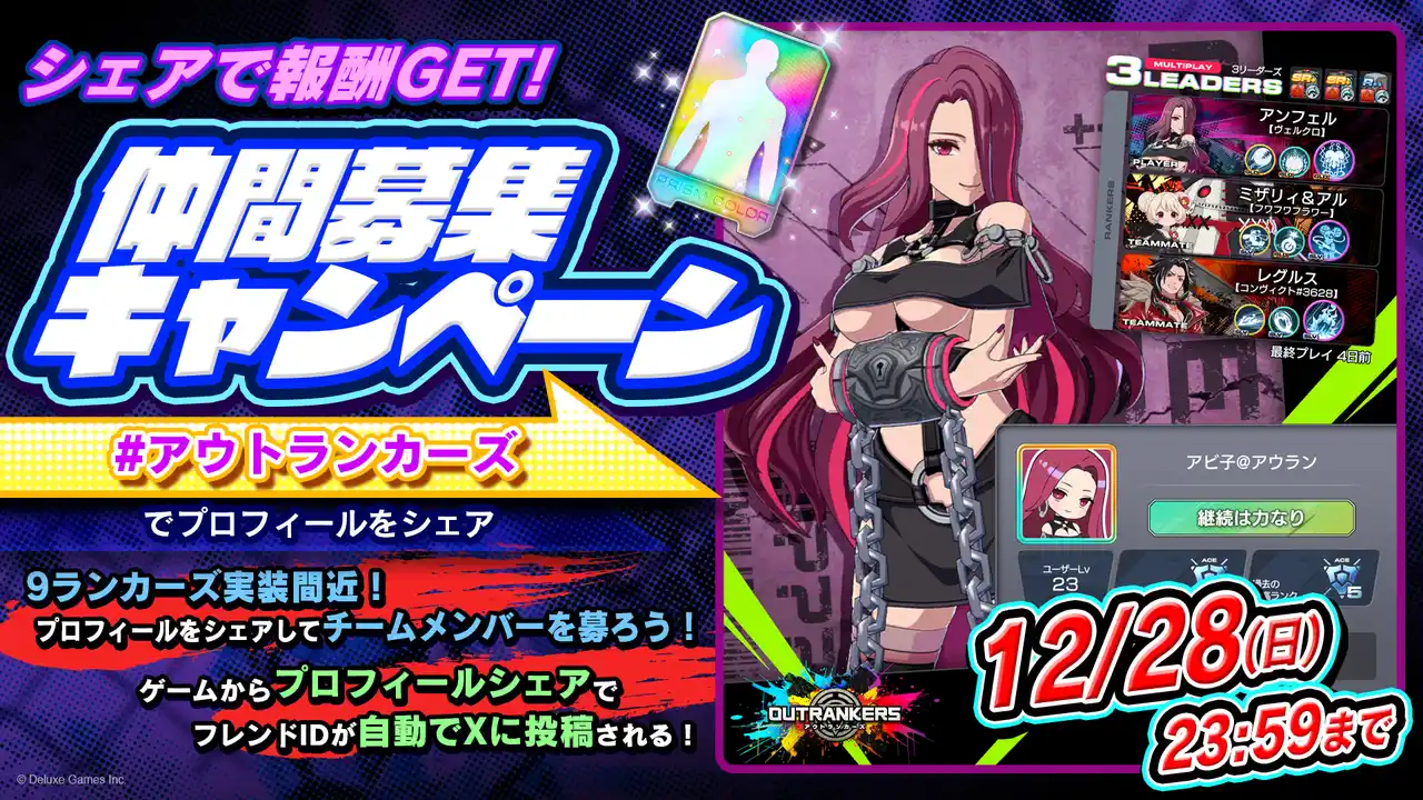 「アウトランカーズ シーズン2直前特番!」配信記念および、『アウトランカーズ』における仲間募集を目的としたキャンペーンをXにて実施します。詳細については各キャンペーンの概要をご参照ください。 |