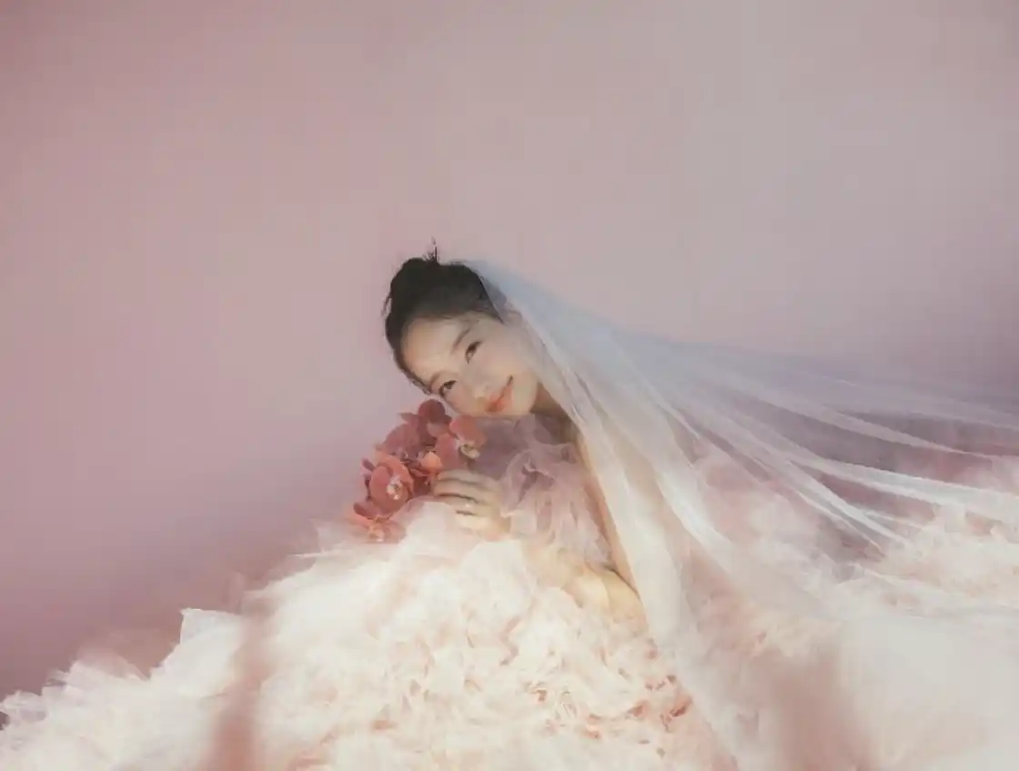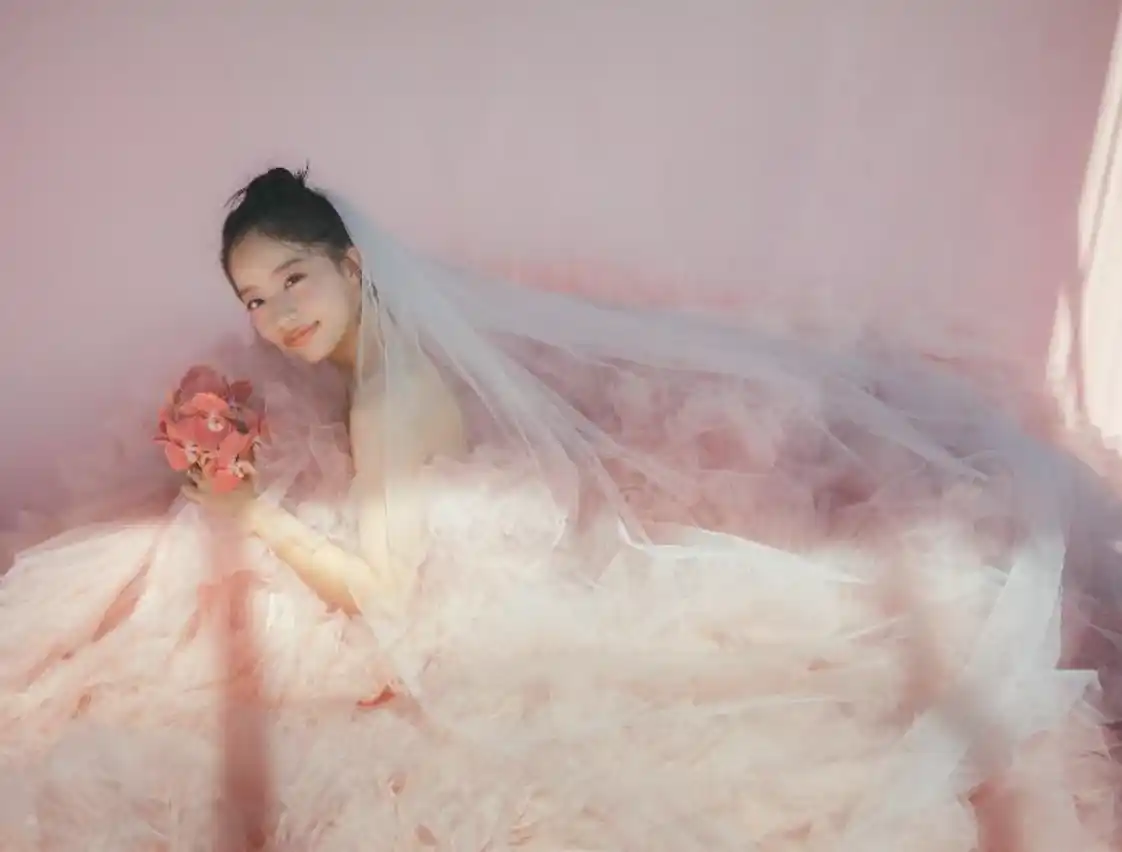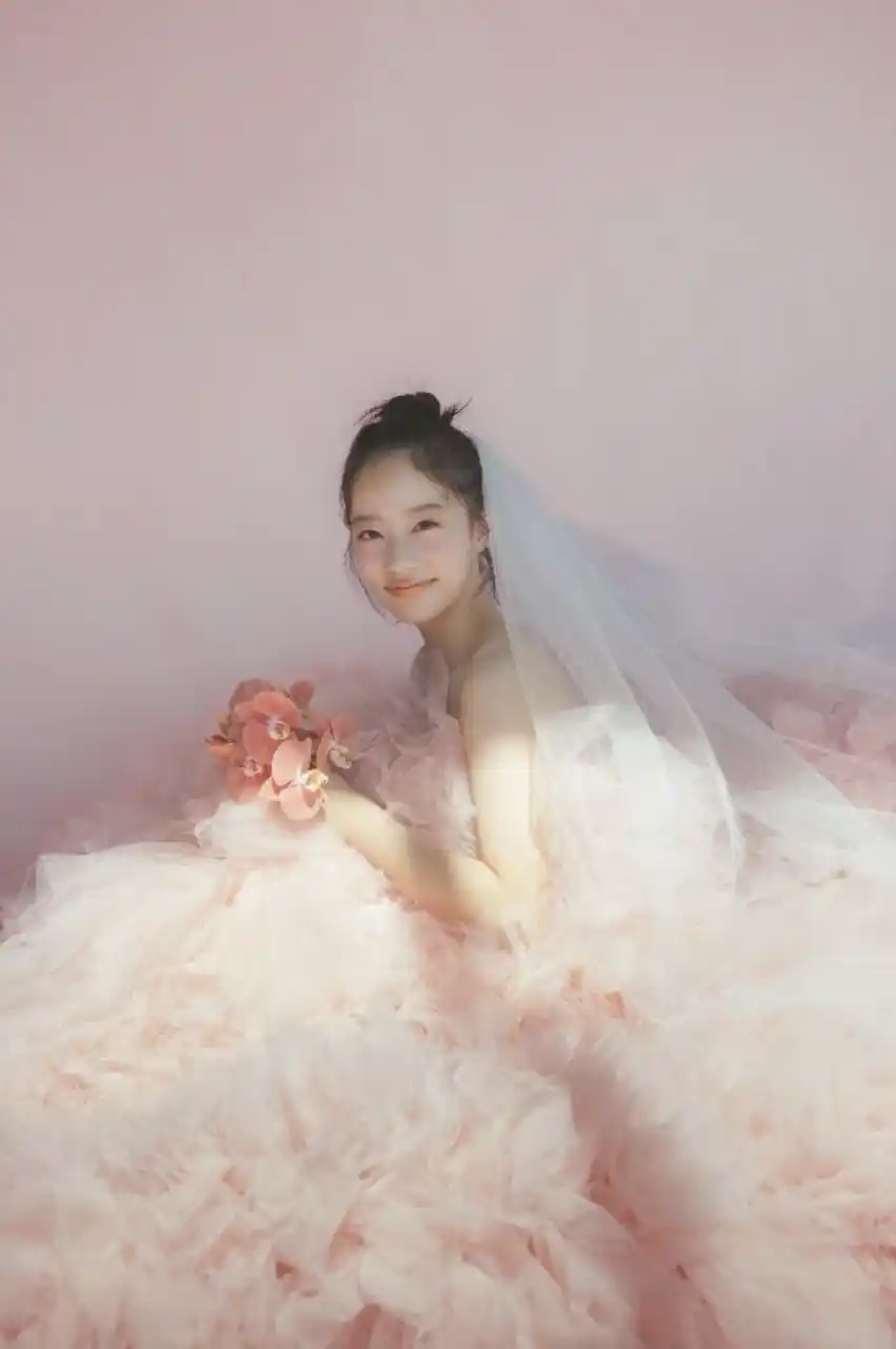 今回着用されたドレスについて、「1個の部屋が埋まるくらいのふわふわのボリュームがとにかくかわいくて、細かいレースの重なりが気持ちをグッと上げてくれました」とお気に入り。今回の表紙にタイトルをつけるなら? という問いには「幸せピンクのときめきの1枚」と表現し、多幸感あふれるドレス姿に納得の様子でした。 |