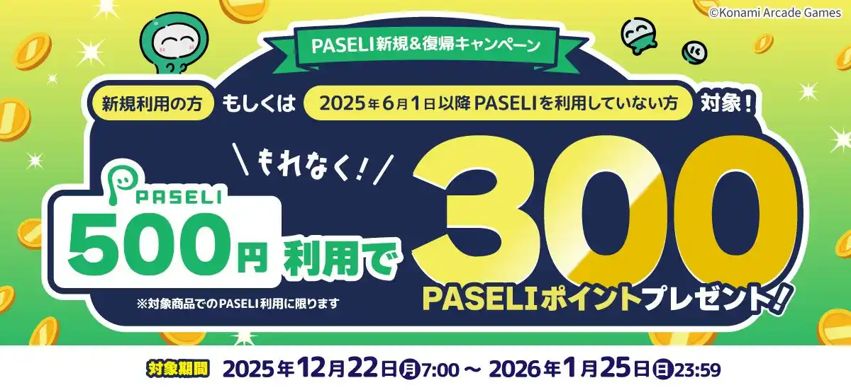 | また、初めて「PASELI」を利用される方、もしくは2025年6月1日(日)以降「PASELI」を利用していない方を対象に、「PASELI」を対象商品で500円以上使用すると「PASELIポイント」が300ポイントプレゼントされる「PASELI新規&復帰キャンペーン」も同時に開催します。 | |||