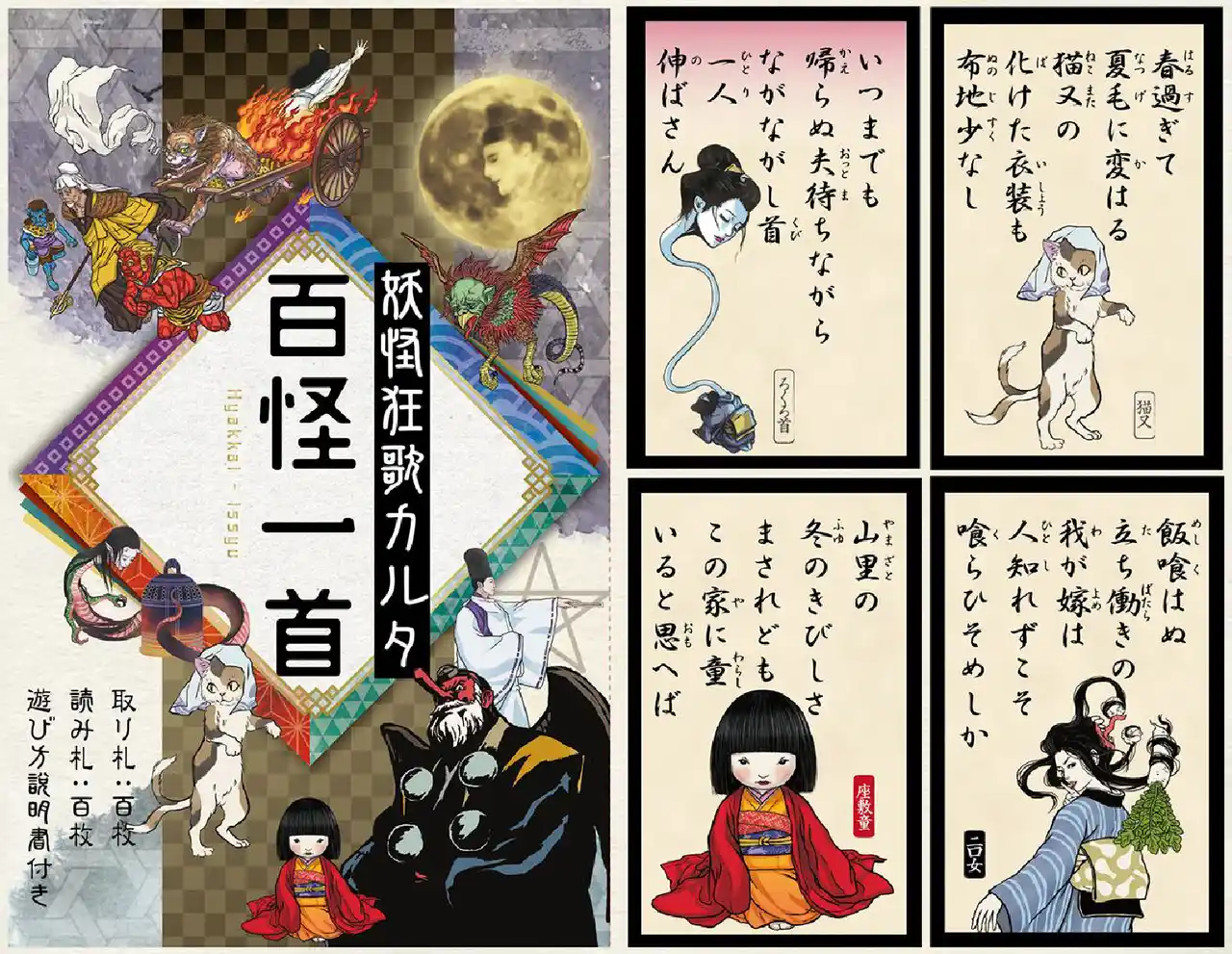 | 「妖怪狂歌カルタ・百怪一首」は、百人一首の内容を全て妖怪や怪談、伝承や伝説に置き換えたオリジナルカルタです。読み札は百人一首と同様に五・七・五・七・七の短歌形式で構成され、下の句にあたる七・七を記した取り札と合わせて、それぞれ100枚ずつで成り立っています。百人一首に親しんでいる方はもちろん、坊主めくりもできるので、初めて触れる方やお子さままで、世代を問わず楽しめる内容です。 | |||||||||