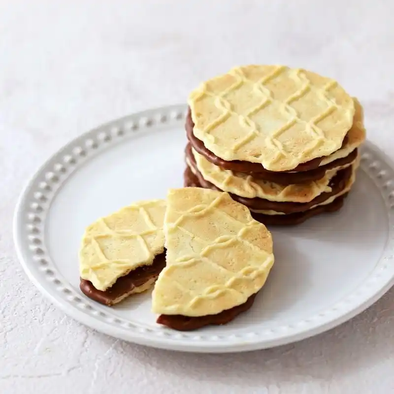 | サクサク食感が人気のワッフルクッキー2種類をご用意しました。「焦がしバター」は北海道産バターミルクパウダーを配合したキャンディーをかけ、表面をキャラメリゼ。「チョコ」は蜂蜜風味のワッフルクッキー生地でミルク風味のチョコがけクッキーをサンドしました。どちらもギフト包装と手提げ袋付きで、そのまま手土産としてお渡しいただけます。 | ||||||||||