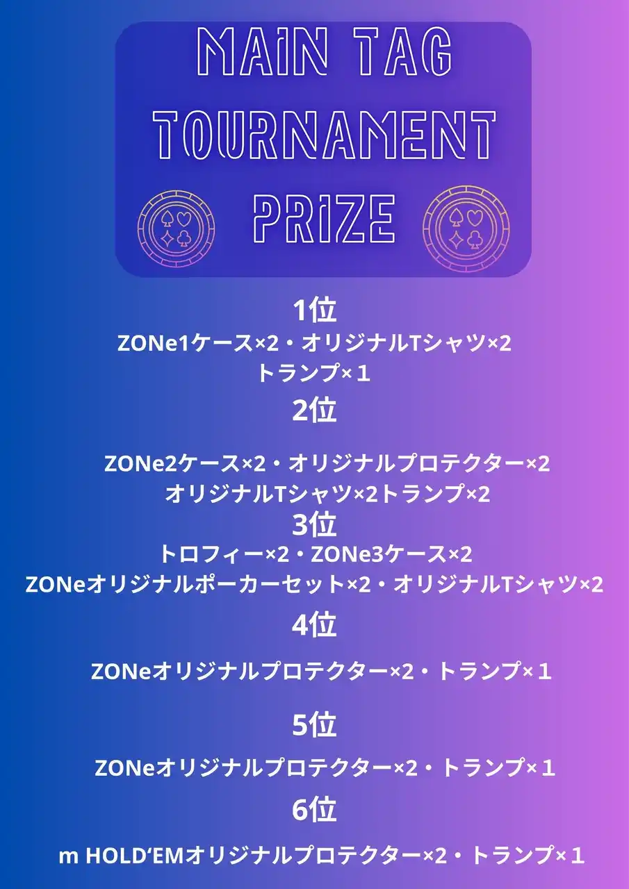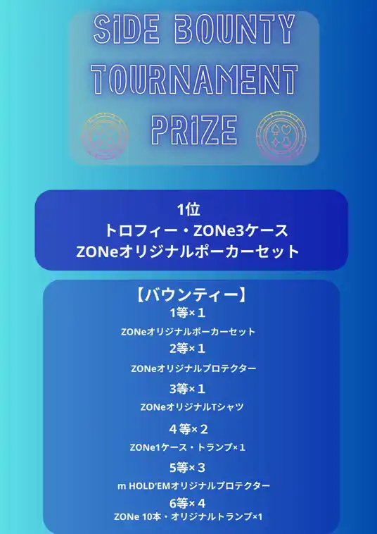 | ■ ZONe ENERGYやオリジナルポーカーセット中心としたメイン、サイドトーナメントの賞品 | |||||||||||