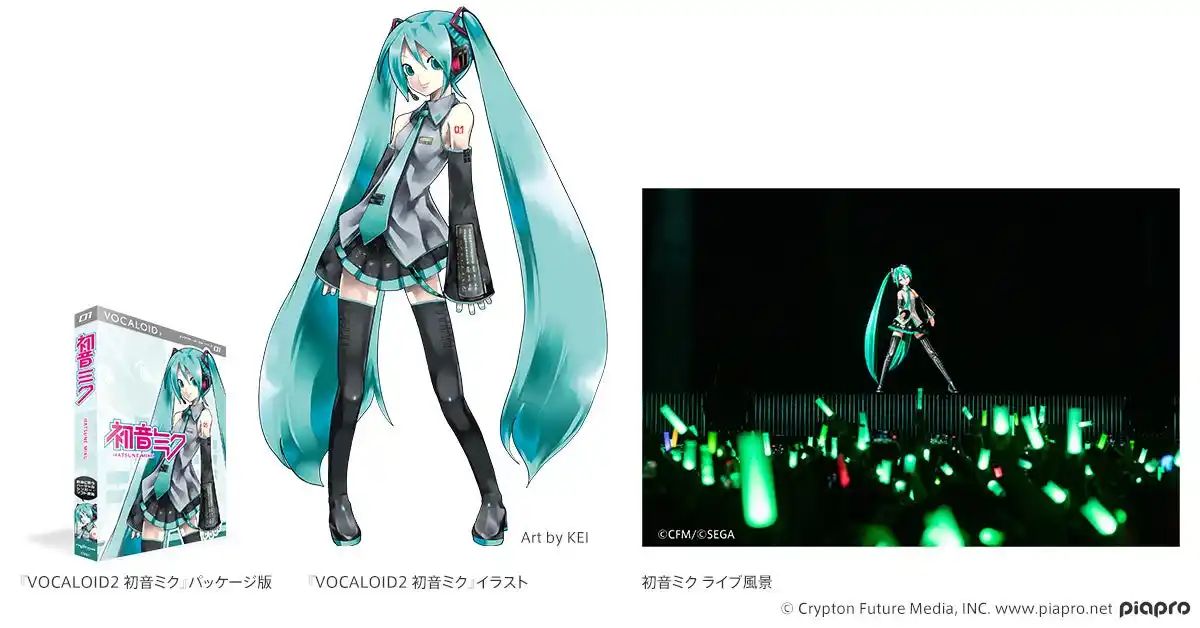 | クリプトン・フューチャー・メディア株式会社が2007年に企画・開発した、歌詞とメロディーを入力すると歌わせることができる歌声合成ソフトウェア。パッケージに描かれたキャラクターは、ブルーグリーンのツインテールが特徴的な姿を持つ。本ソフトで作られた音楽がインターネット上に多数投稿されたことでイラスト・歌・ダンスなどの創作の連鎖が拡がり、文化現象となった。 | |||||||||||||