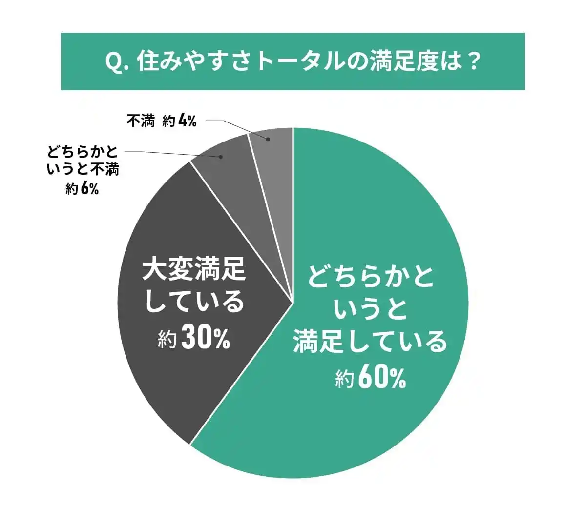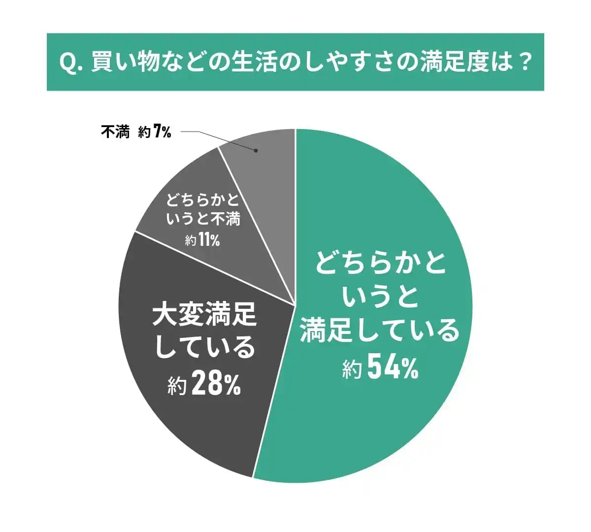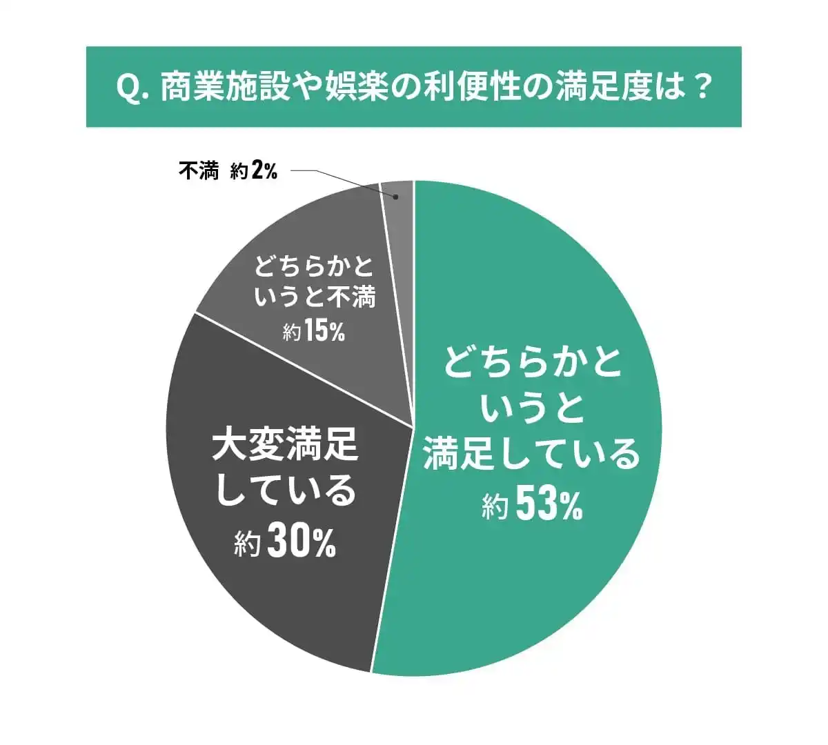 生活のしやすさについては約82%の住民が満足しています。都心部でありながら、日常生活に必要な店舗が揃っている点が評価されています。 |