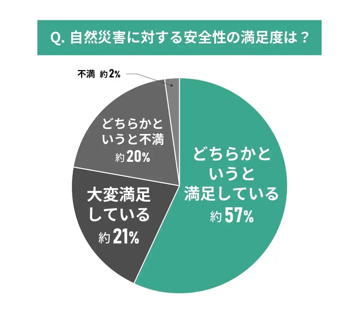 自然災害への安全性については約78%の住民が満足している一方で、約22%が不満を感じており、一定の懸念があることがわかります。 |