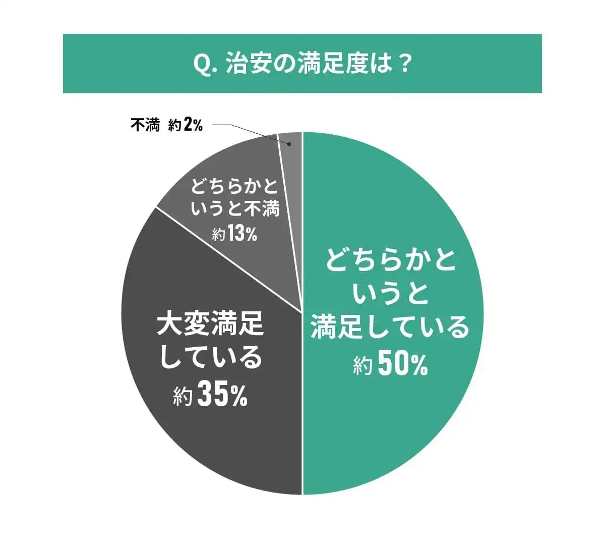 治安については約85%の住民が満足しており、安心して暮らせる環境であることがわかります。 |