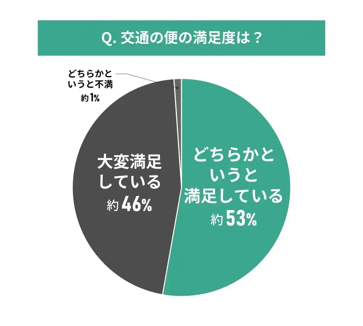 交通の便については、実に約99%の住民が満足しており、全調査項目の中で最も高い満足度を記録しました。中央区の立地の良さが数字に表れています。 |