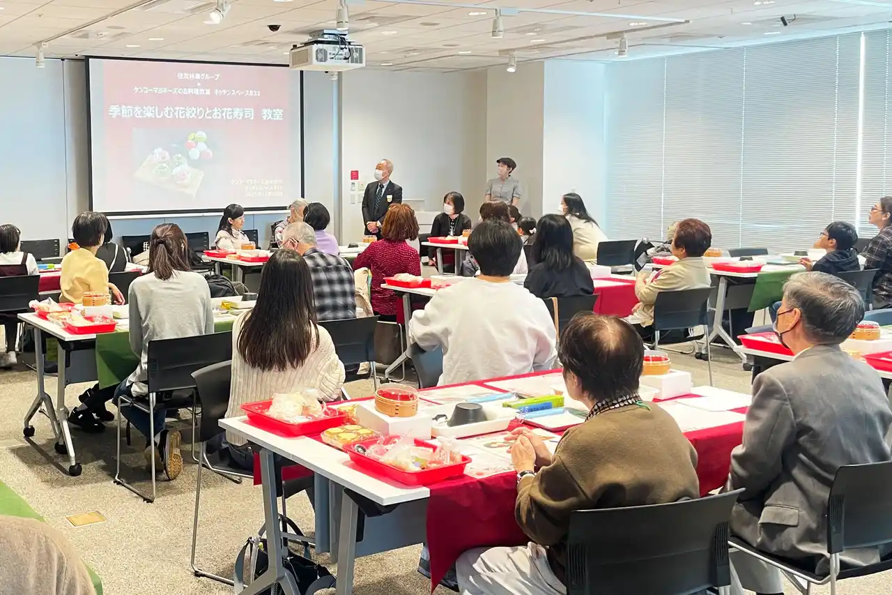 | 11月30日(日)にTOTO・DAIKEN・YKK AP 東京コラボレーションショールーム(東京都渋谷区)で行われた住友林業株式会社主催のオーナー感謝祭において、オファーをいただき、“季節を楽しむ花絞りとお花寿司 教室”が開催しました。 | |||||||||