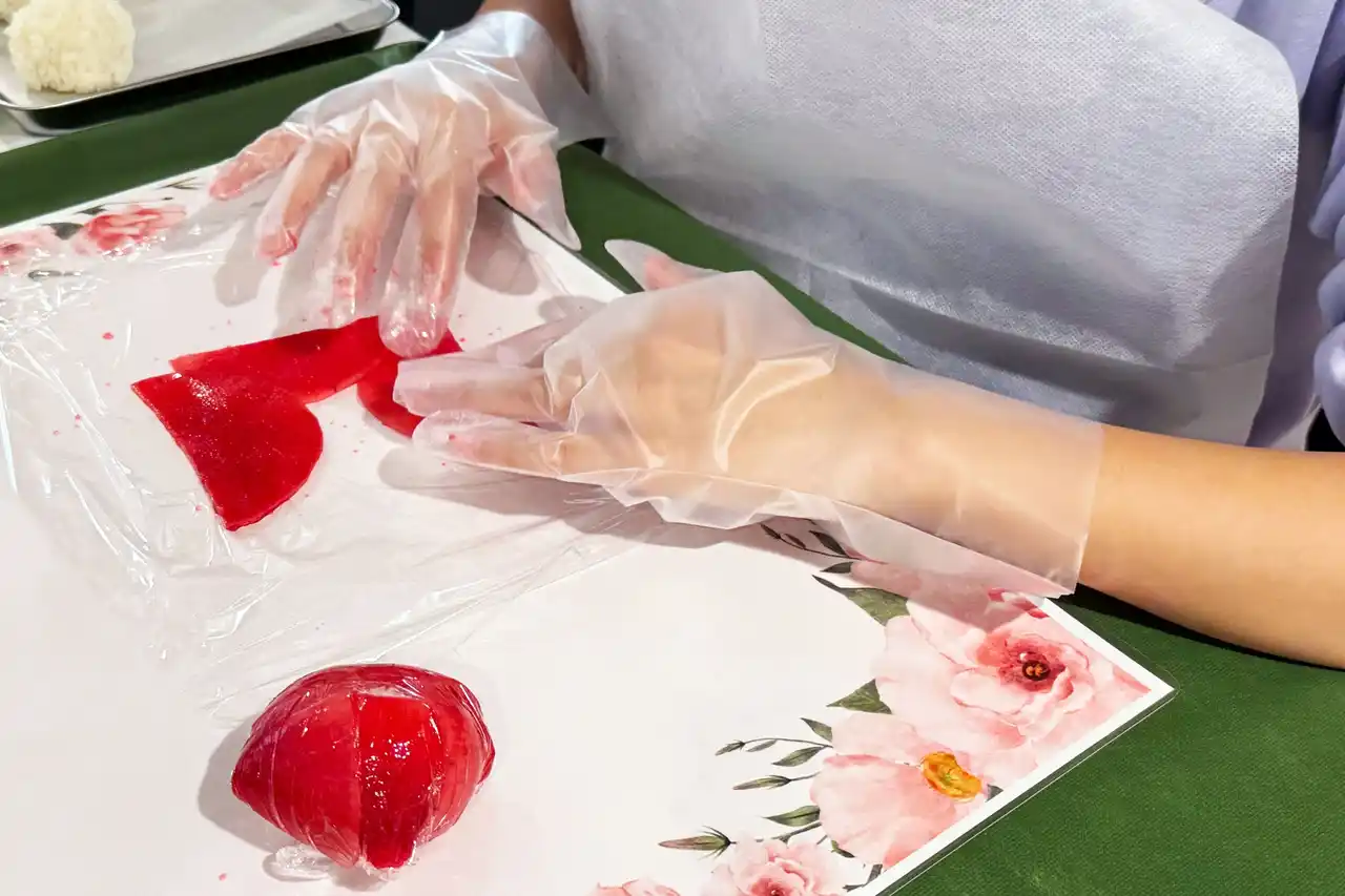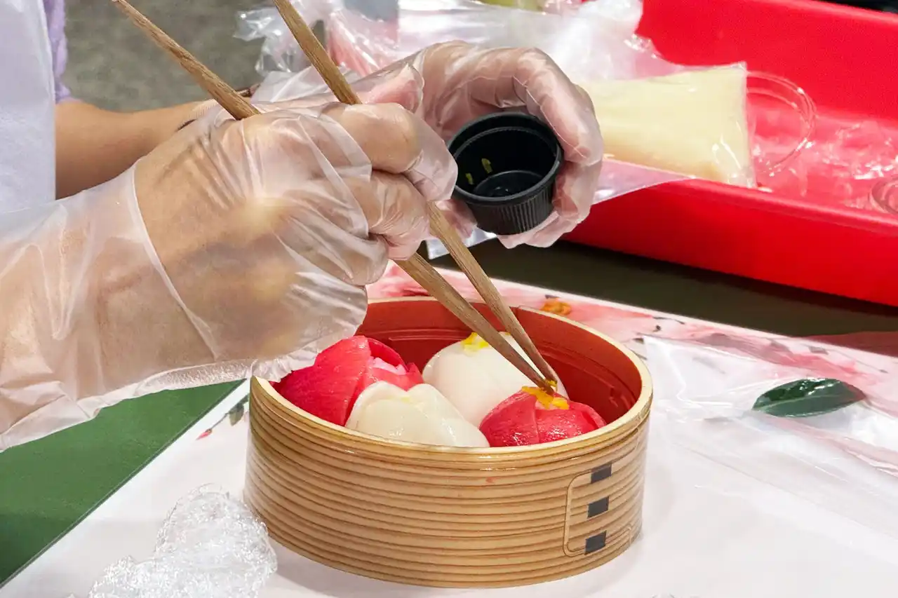| マリネした大根をラップに広げてご飯と一緒に巻くだけで簡単に作れるため、小さなお子様からご年配の方までどなたもとても綺麗に作ることができていました。 | |||||||||