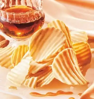メープルシュガーとアーモンドプラリネペーストを加えたチョコレートを、ポテトチップの片面にコーティングしました。ほんのり塩味のポテトチップとやさしいメープルシュガーの風味が絶妙なバランスの、手が止まらなくなるおいしさです。後味にほんのりナッツが香ります。 |