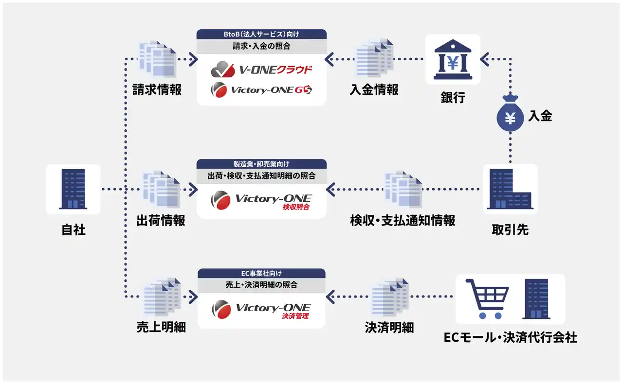 今後も「V-ONEクラウド」は会計・販売管理システムをはじめ、さまざまな経理周辺システムとの連携を推進し、入金消込作業の効率化によってバックオフィス業務の生産性向上に貢献してまいります。 |