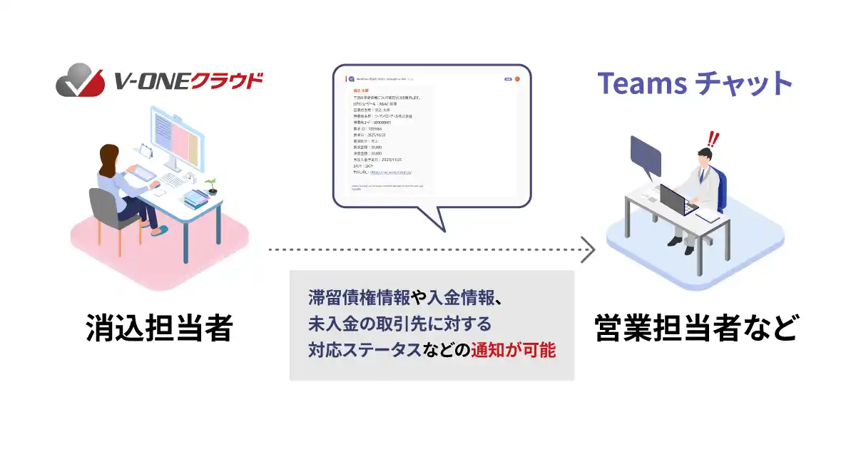 このような作業は「V-ONEクラウド」とMicrosoft Teamsのチャット機能とを連携することで、営業担当者や他の関係者へ未入金の督促や過入金の調整等が必要となる取引先の情報を共有する作業を効率化することが可能となります。 |