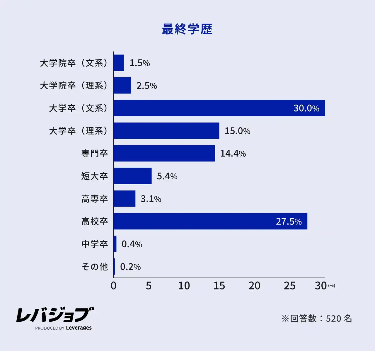 最終学歴は「文系大卒(30.0%)」が最多で、「高校卒(27.5%)」「理系大卒(15.0%)」が続き、幅広いバックグラウンドの人がブルーカラー職へ転向していることが分かります。 |