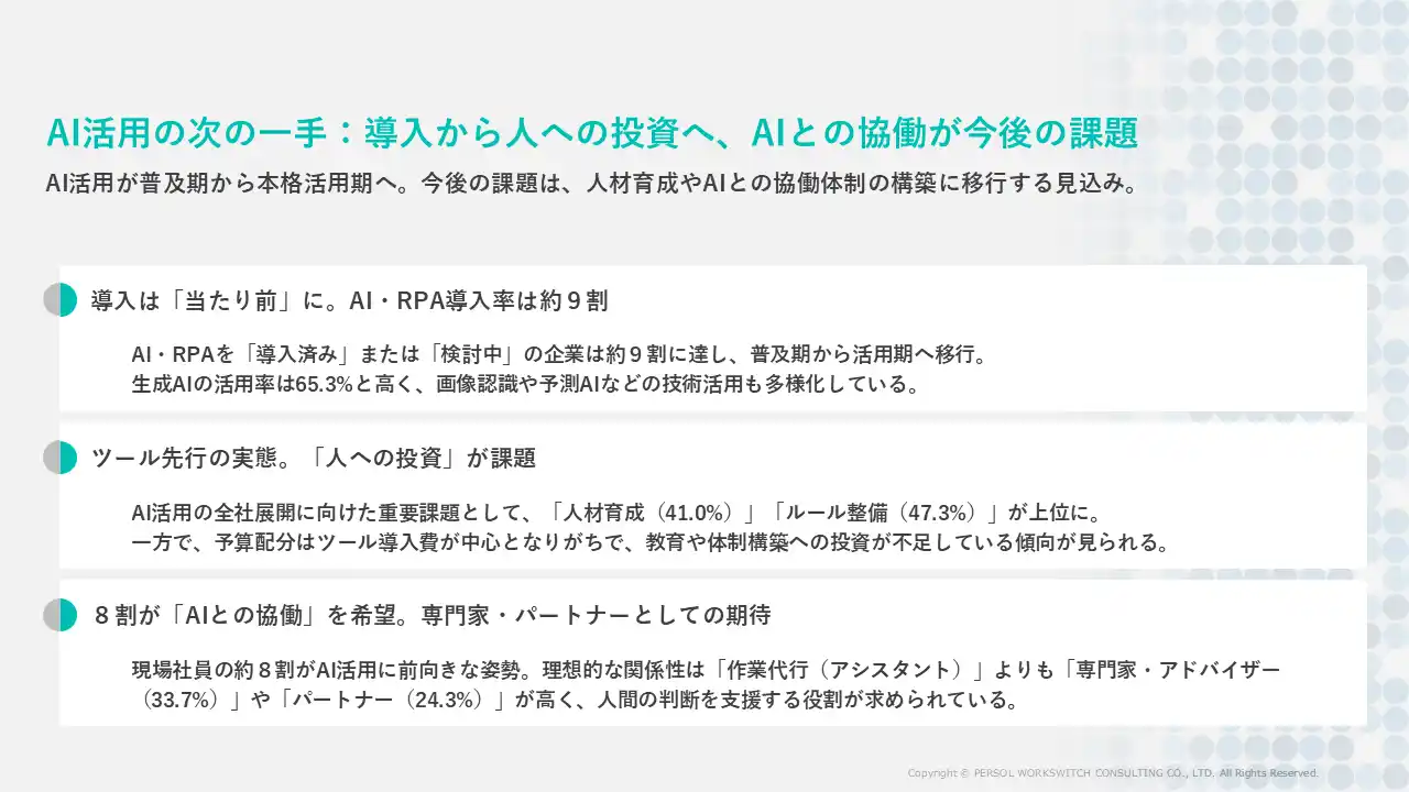 本調査の結果、AI・RPAの導入率は約9割に達し、企業の標準的な取り組みとして定着している一方で、ツール導入に偏重し、それを使いこなすための「人材育成」や「ガイドライン整備」といった組織・人への投資が追いついていない実態が浮き彫りになりました。 |