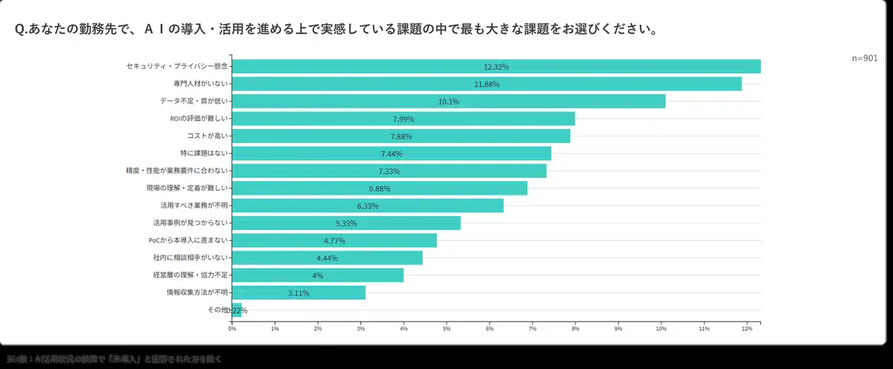 AI関連の年間予算として「1,000万円以上」を投じる企業も一定数存在する一方、その使途はライセンス費やシステム導入費が中心となる傾向があります。全社的な活用推進に進むためのとして、「セキュリティ・プライバシー懸念(12.3%)」や「専門人材がいない(11.9%)」が上位に挙がっており、ハード(ツール)だけでなくソフト(人・組織)への投資バランスの見直しが急務となっています。 |