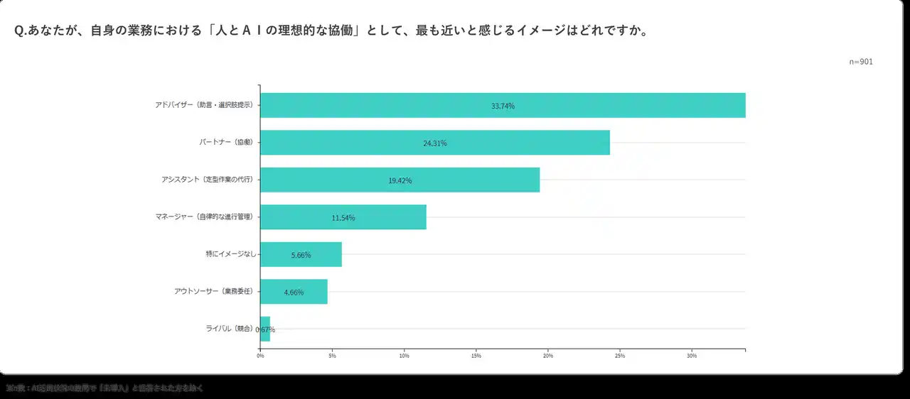 現場社員に対し「人とAIの理想的な協働イメージ」を尋ねたところ、「専門家・アドバイザーとして助言をもらう(33.7%)」や「同僚・パートナーとして協力する(24.3%)」が上位を占め、AIは人間の能力を拡張し、共にはたらく存在として捉える意識が高まっています。 |