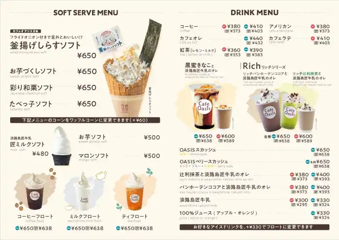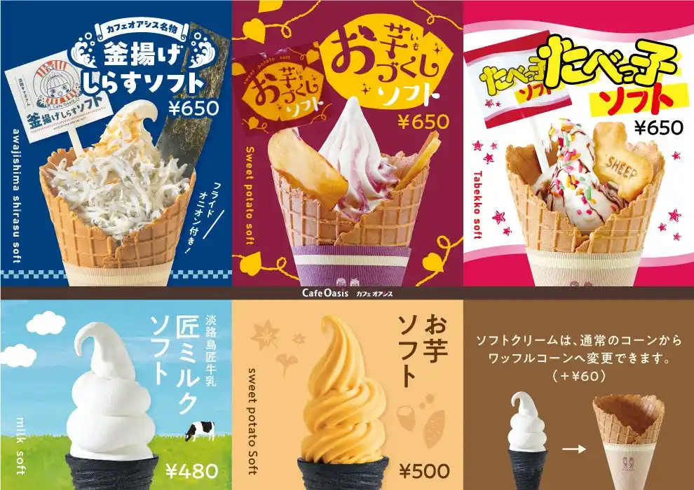 淡路島の玄関口に位置し、明石海峡大橋を眺めながら旬の食材を味わえるレストランや、特産品のショッピングを楽しめる淡路ハイウェイオアシス(運営:ユーアールエー株式会社/本社所在地:兵庫県淡路市大磯)の、「カフェオアシス」(オアシス館内1F)が、ソフトクリームの形状・内容をリニューアル!!年末年始の運転休みのひとときを当カフェでお過ごしください。 |
