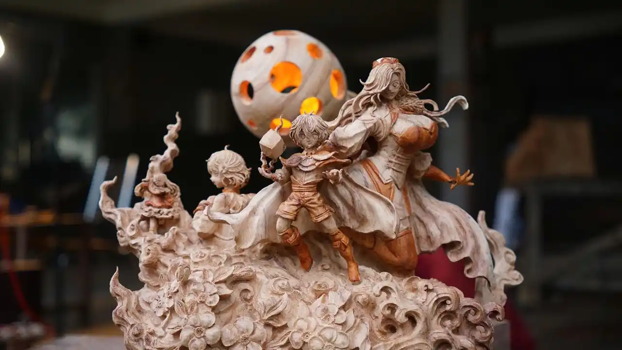 SNS 総フォロワー数119 万人を誇る、ベトナム在住の世界的木彫アーティスト・Duy 氏が、本作の世界観を“木”で表現。主人公ヴァンは、“最も不遇”とされる「生産系魔術」を駆使し、木を“ウッドブロック”という材質に変化させ、そこから色々な建築物やアイテムを創り上げて村の開拓を進める。そんなヴァンの姿を彷彿とさせる超絶技巧の一作が誕生。大きな木の塊からチェーンソーや、彫刻刀でどんどん削って作りあげたのはヴァン・パナメラ・アルテの木彫りの像。圧倒的な迫力と、作品に込められた魔術の世界観が見事に表現され、創る楽しさが凝縮された心躍る作品となっている。 |