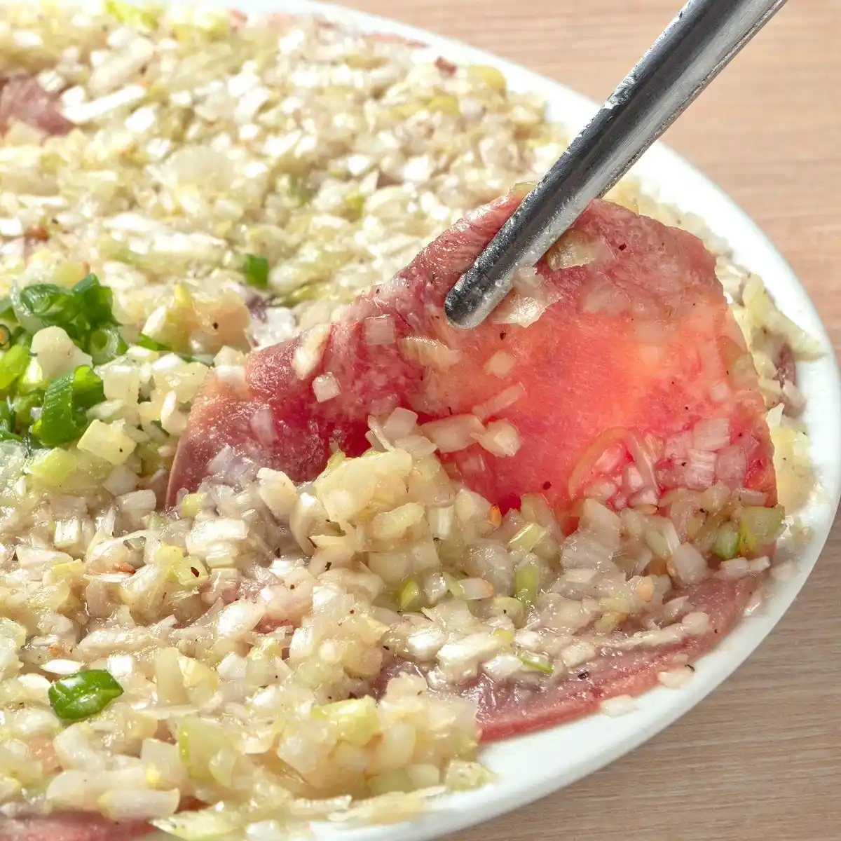 薄切り牛タンに大人気旨塩にんにくタレをたっぷり擦り込み、寿司下駄にドーーンと盛り付けた、ときわ亭の新名物です。 |